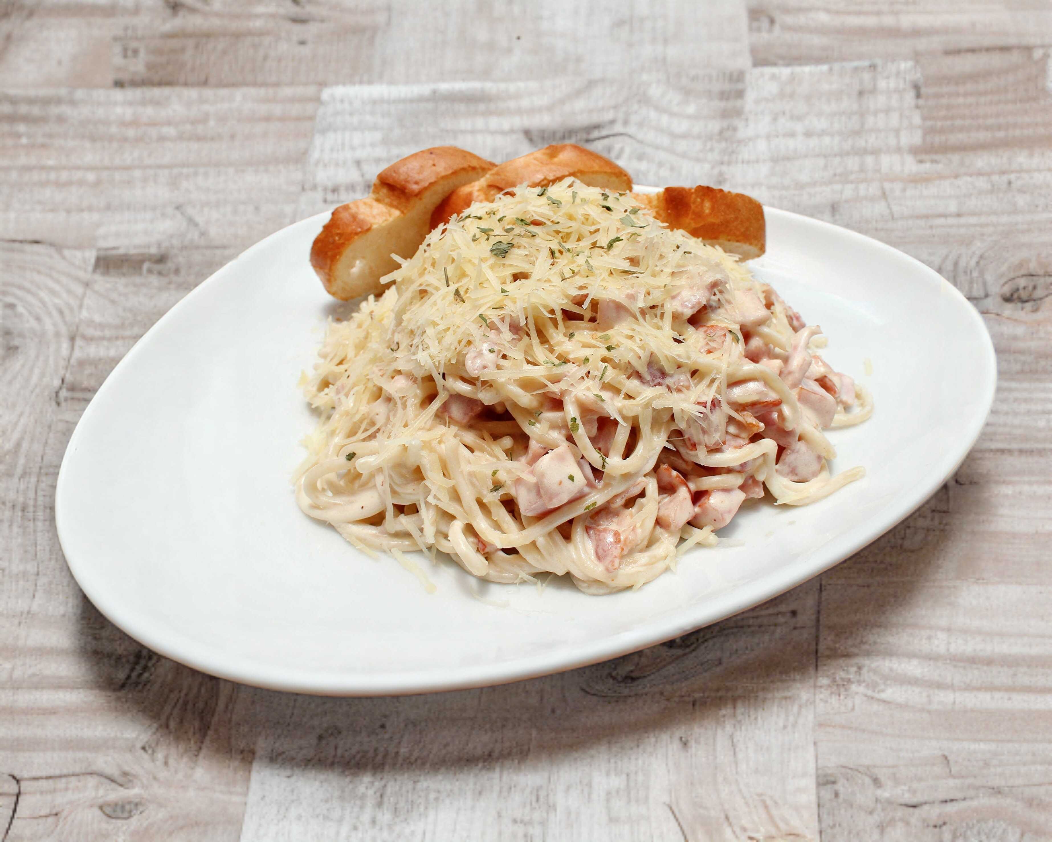 Pasta blanca, un toque de jamón y tocineta con parmesano.