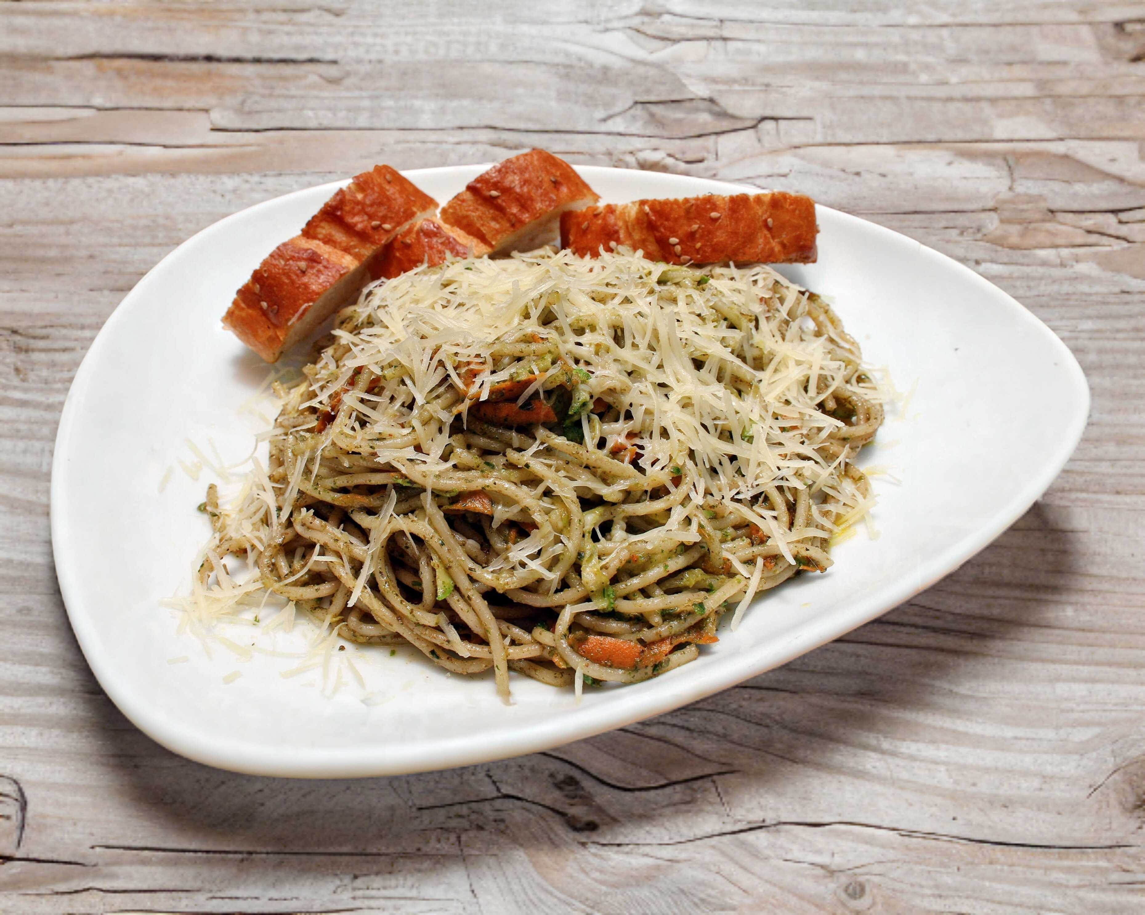 Pasta pesto, verduras y queso parmesano.