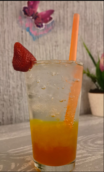 Lechera, fresa, durazno, kiwi, plátano, crema batida y chispas.