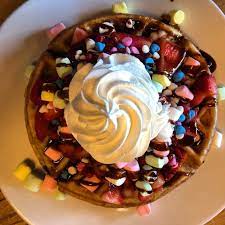 Queso Philadelphia, plátanos con crema, nuez, crema batida y Kit Kat.