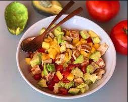 Lechugas, fajitas de pollo, mango, arándano, queso panela, pasta y salsa de fruta de la pasión.