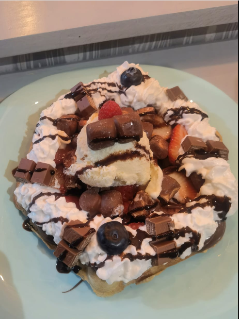 Nutella, fresas, crema batida, choco bombón, Kit Kat y helado de vainilla.