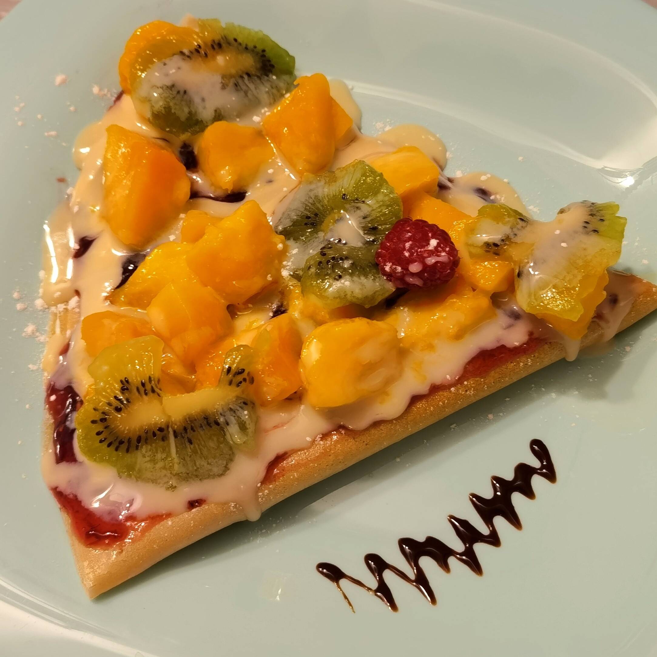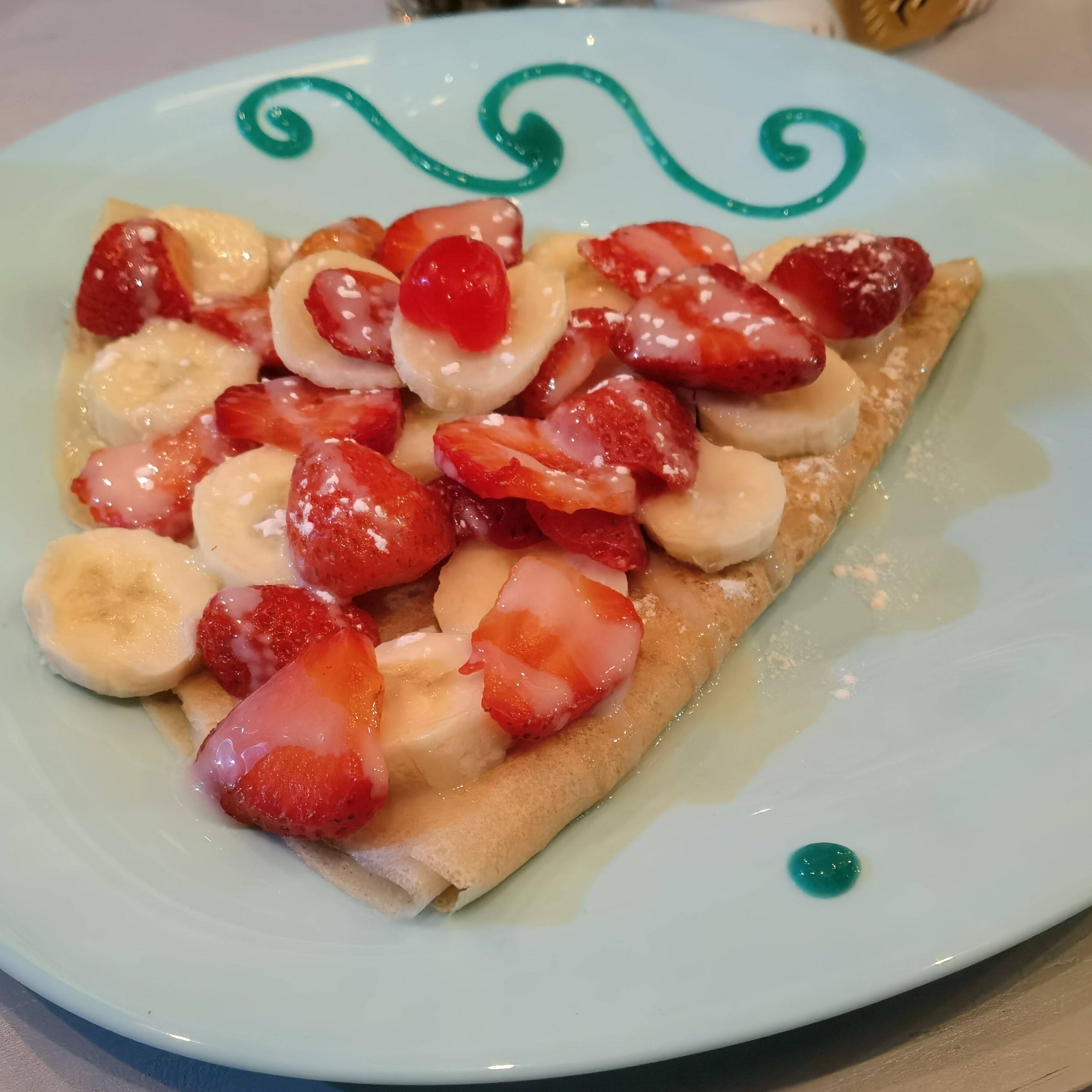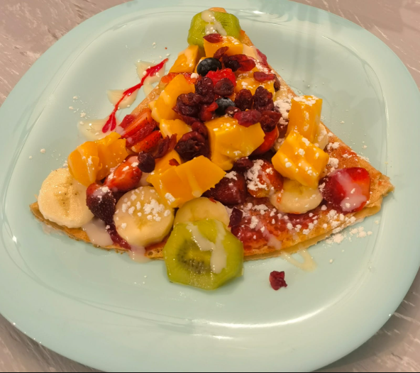 Queso Philadelphia, mango, plátano, fresa, kiwi, arándano y mermelada de pétalos de rosas.