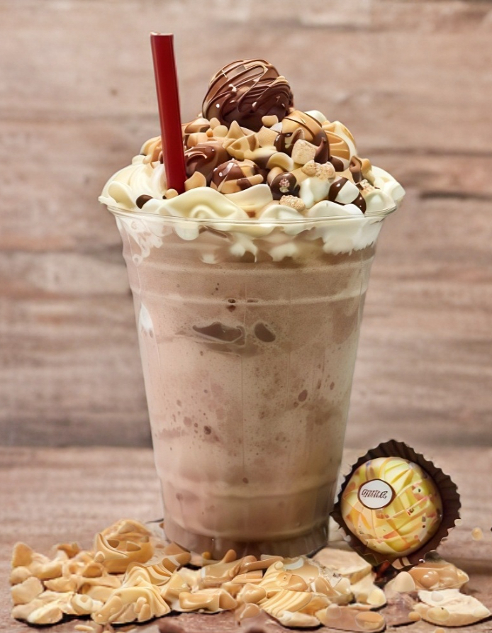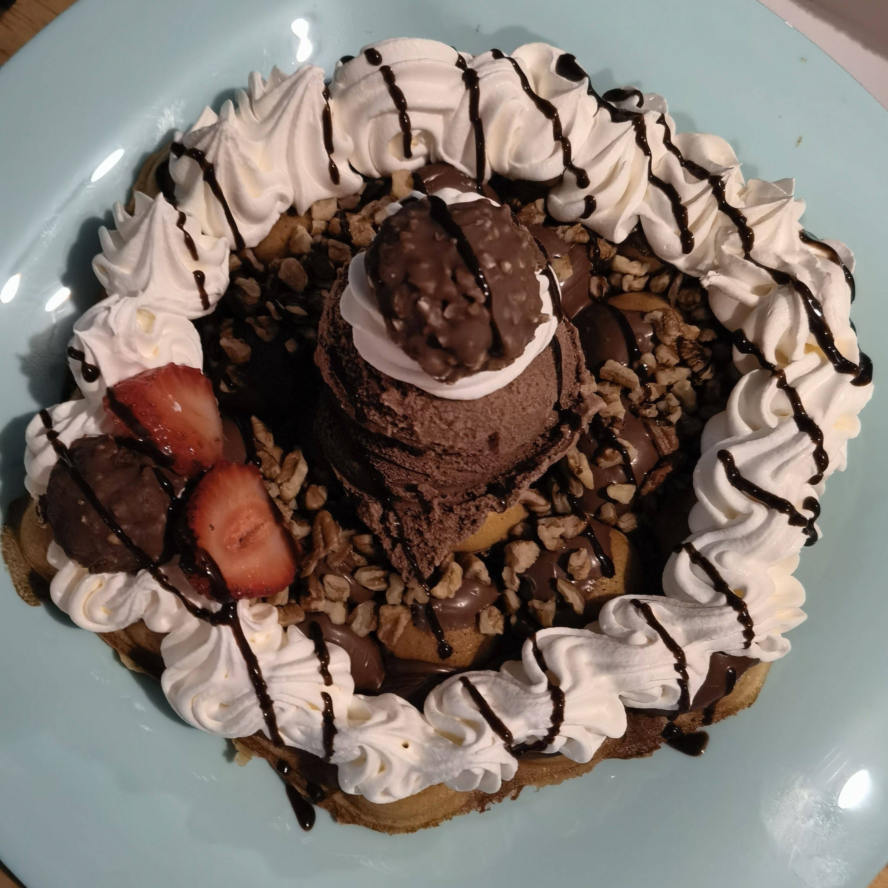 Nutella, nuez, helado de chocolate, crema batida y Ferrero.