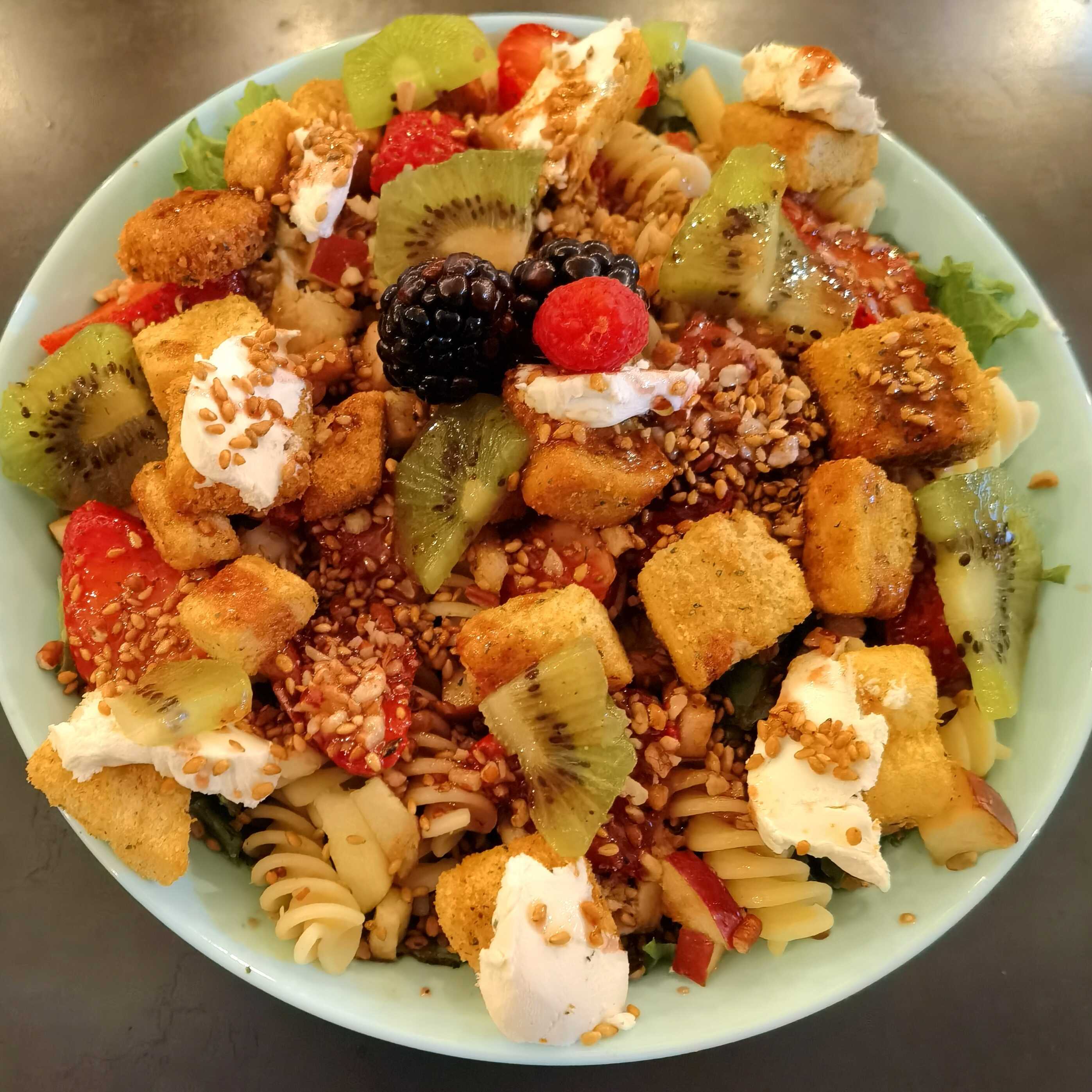 Lechugas, fajitas de pollo, manzana, fresa, kiwi, pasta, queso crema, nuez, ajonjolí y salsa de frutos rojos.