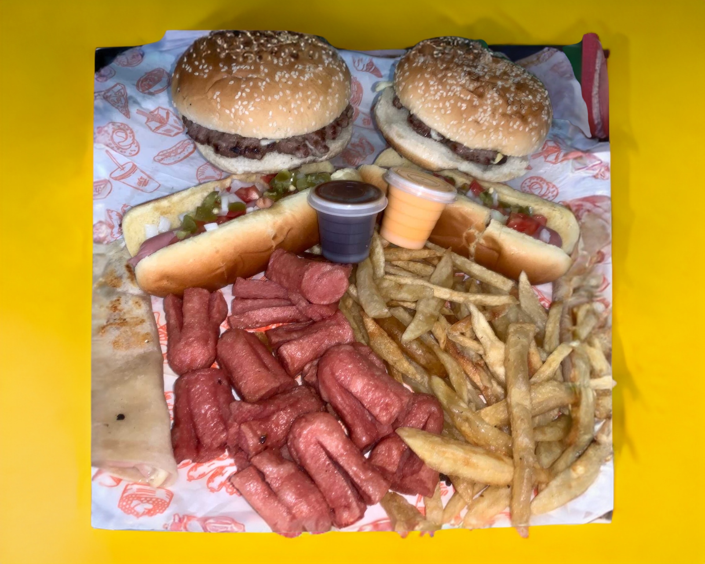 2 Hamburguesas Jumbo,2 Hot dogs Queso y tocino,2 Sincronizadas Dobles,2 ordenes de salchipulpos o de nuggets, 2 ordenes de papas.Preparados con Jitomate,Cebolla,Chile,Catsup,Mostaza,Mayonesa