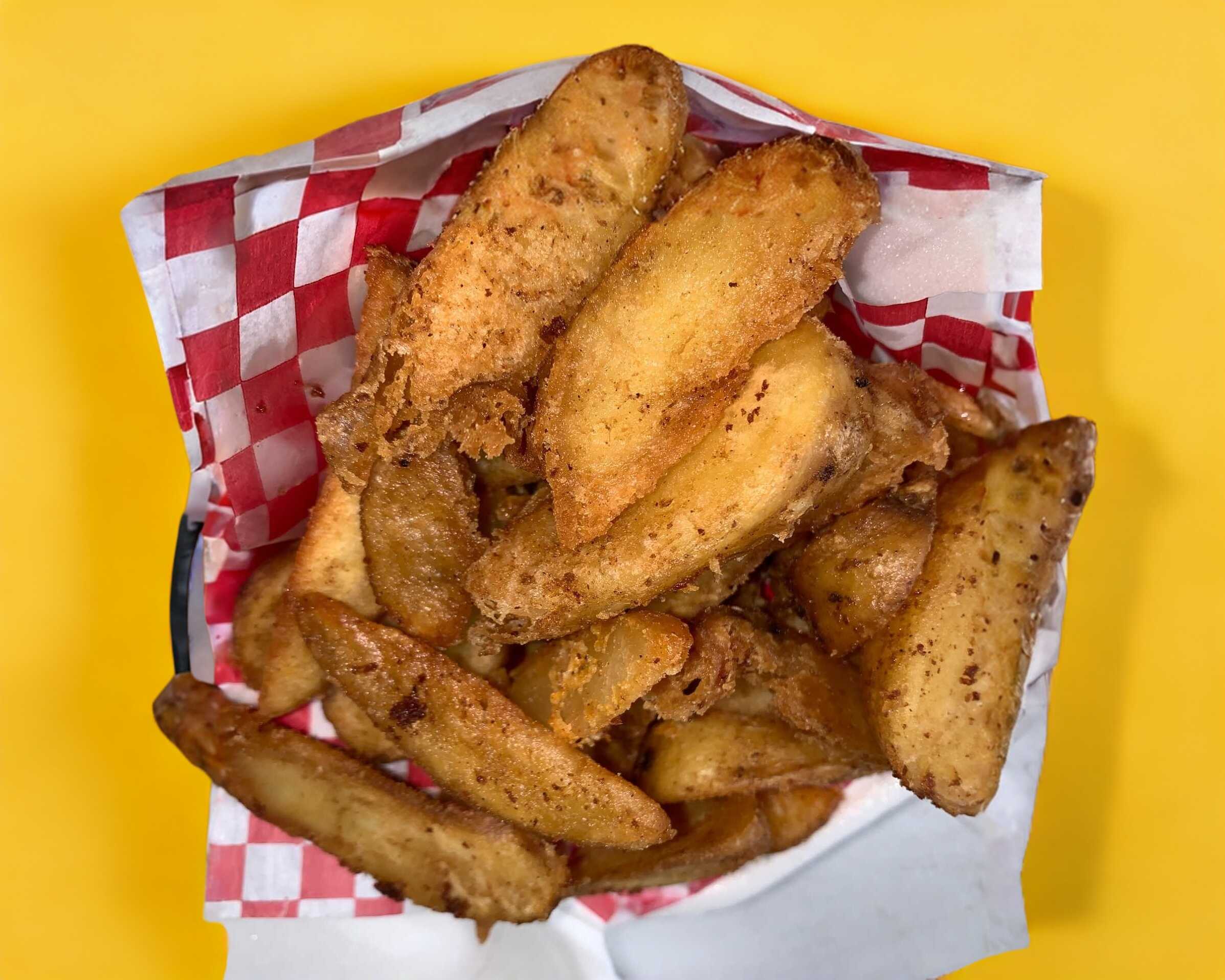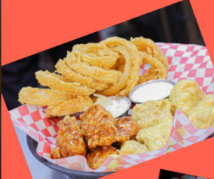 4 Dedos de queso, 6 aros de cebolla, 60 g de papas a la francesa y 3 alitas.
