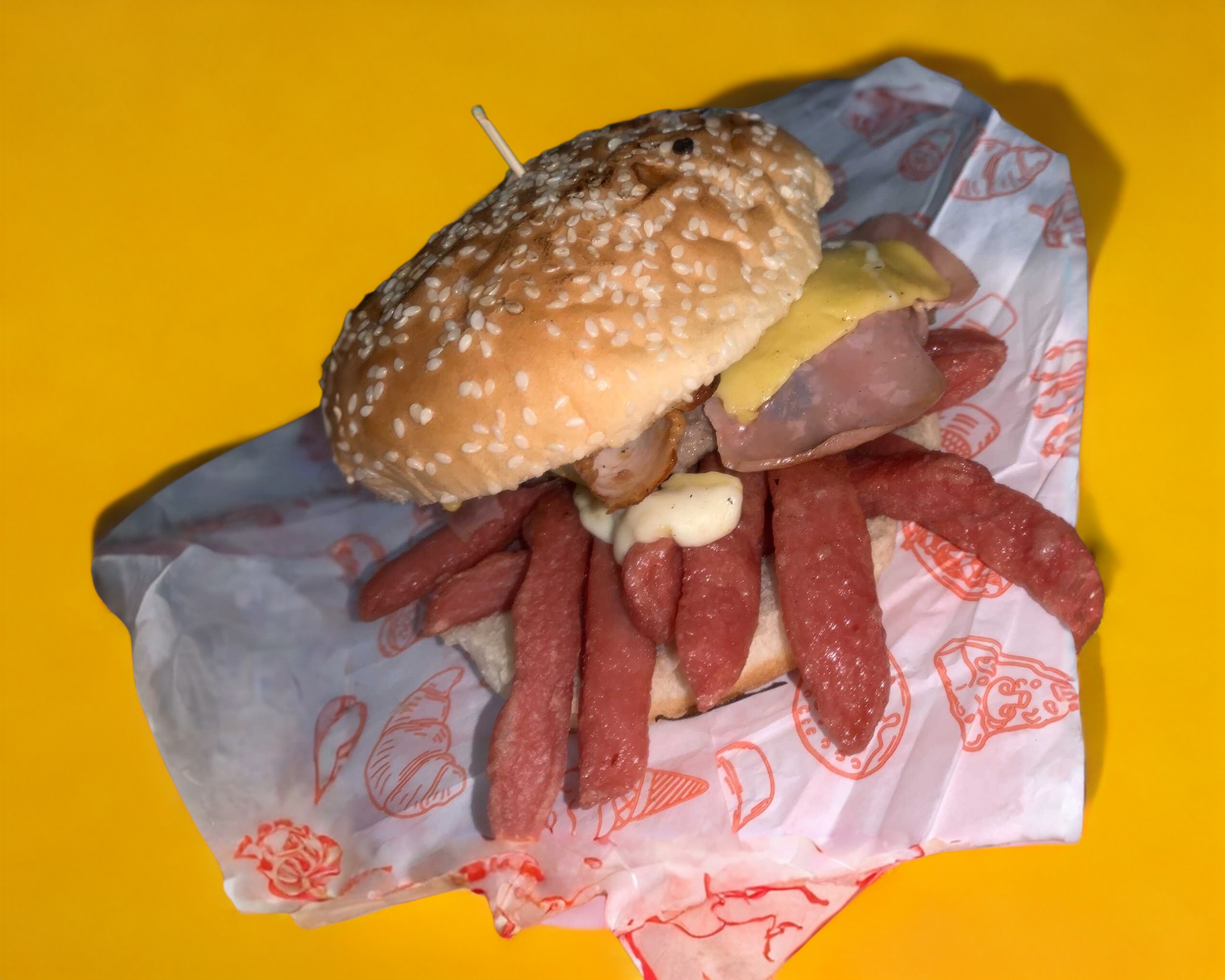 2 hamburguesas con tocino y queso, 2 hot dog con tocino y queso, 2 sincronizadas sencillas, 1 salchipulpos, 1 orden de papas a la francesa.Preparados con Jitomate,Cebolla,Chile,Catsup,Mostaza,Mayonesa