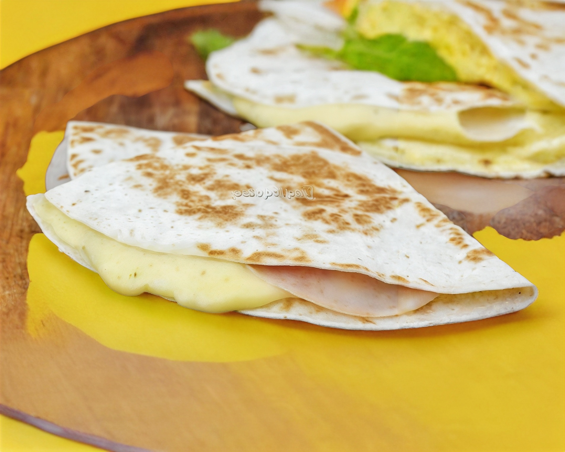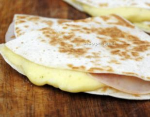 Tortilla de harina con jamón, queso amarillo y queso oaxaca.