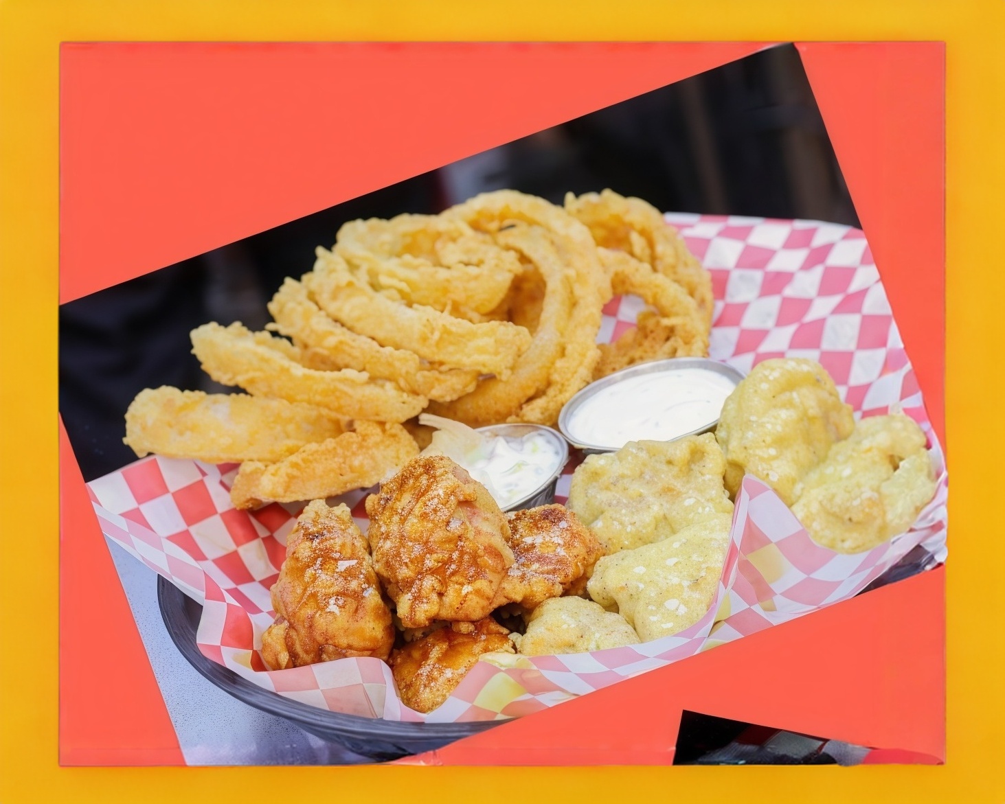 60 g De papas a la francesa, 4 dedos de queso y 6 aros de cebolla con 3 tiras de pollo.