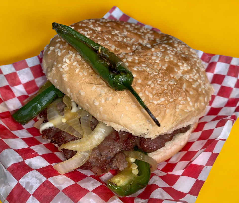 Dos carnes de res con quesillo y queso americano. Preparada con jitomate, cebolla, chile, mayonesa, cátsup y mostaza.