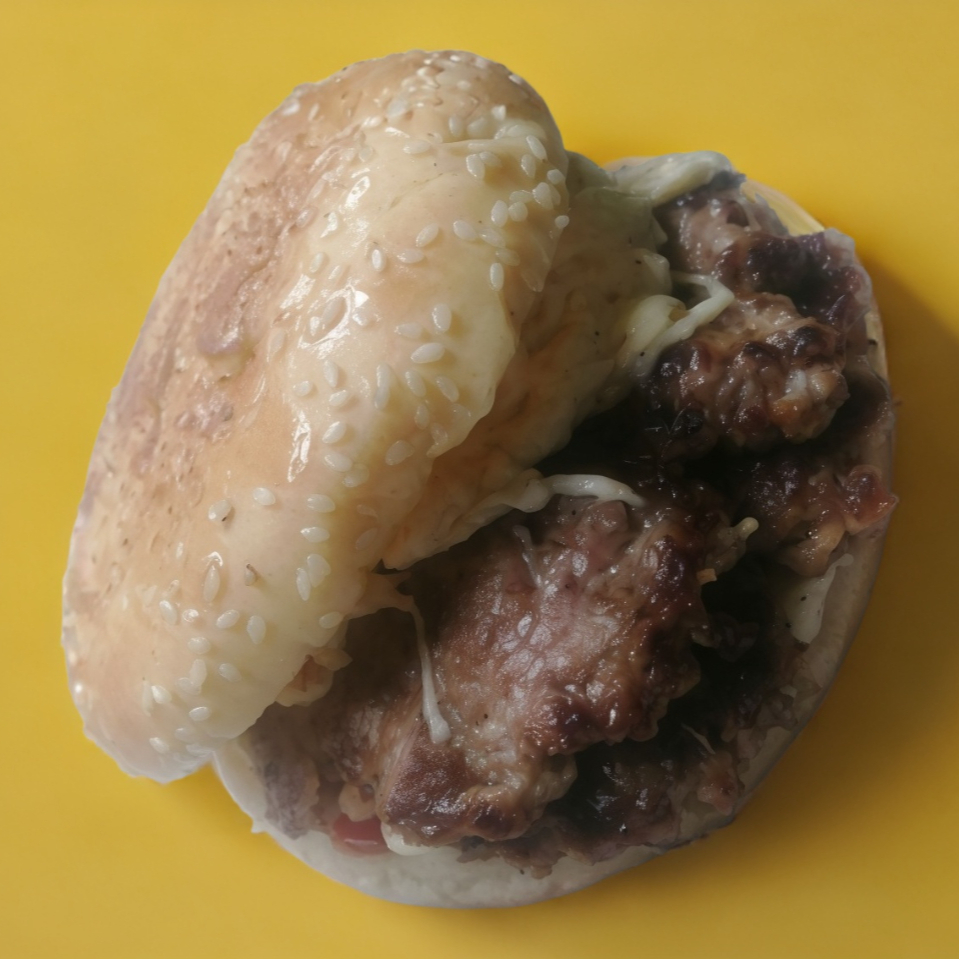 Carne de res con quesillo o queso americano. Preparada con jitomate, cebolla, chile, mayonesa, cátsup y mostaza.