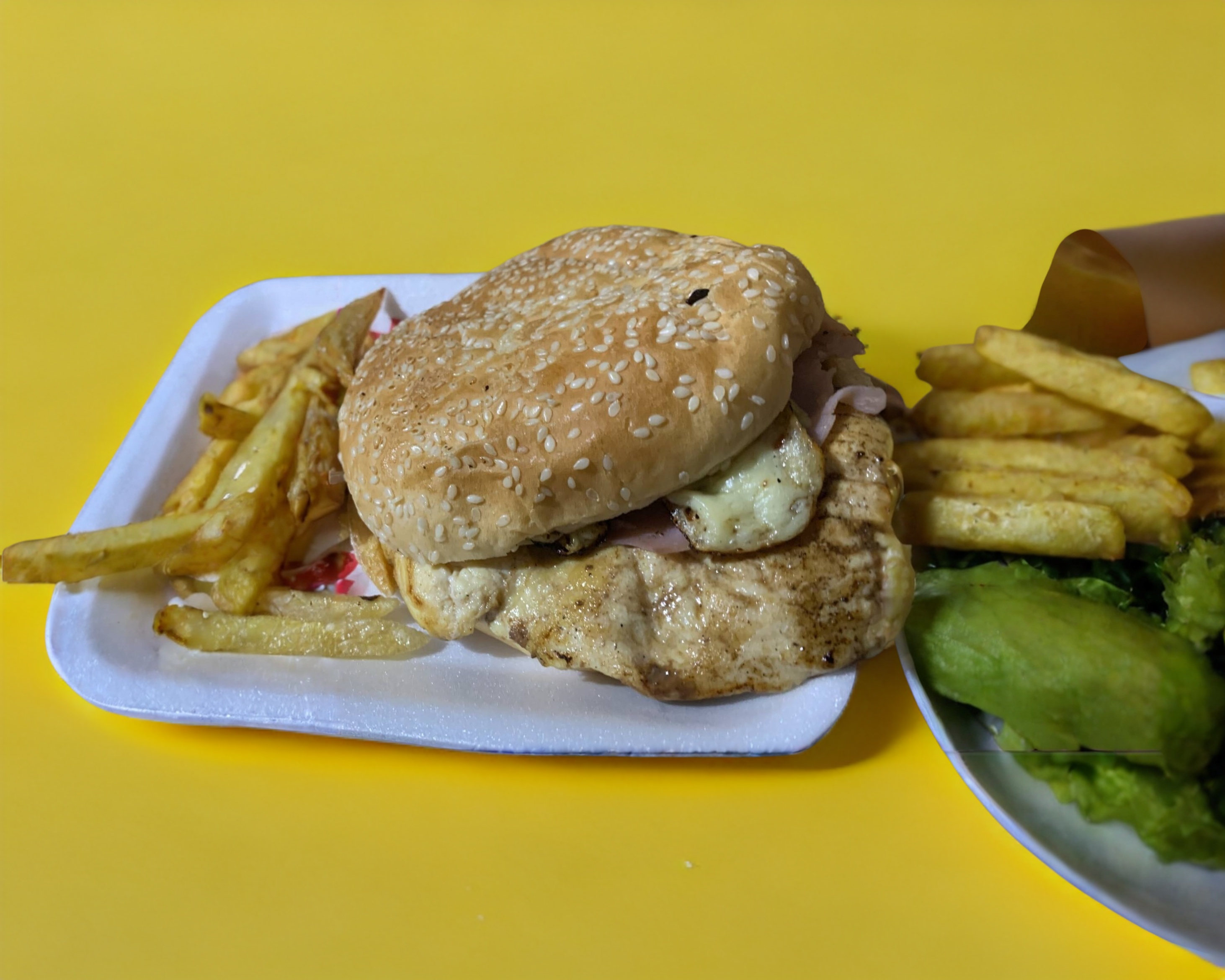 Pechuga a la plancha, jamón, queso americano, quesillo. Preparada jitomate, cebolla, chile, mayonesa, cátsup y mostaza.