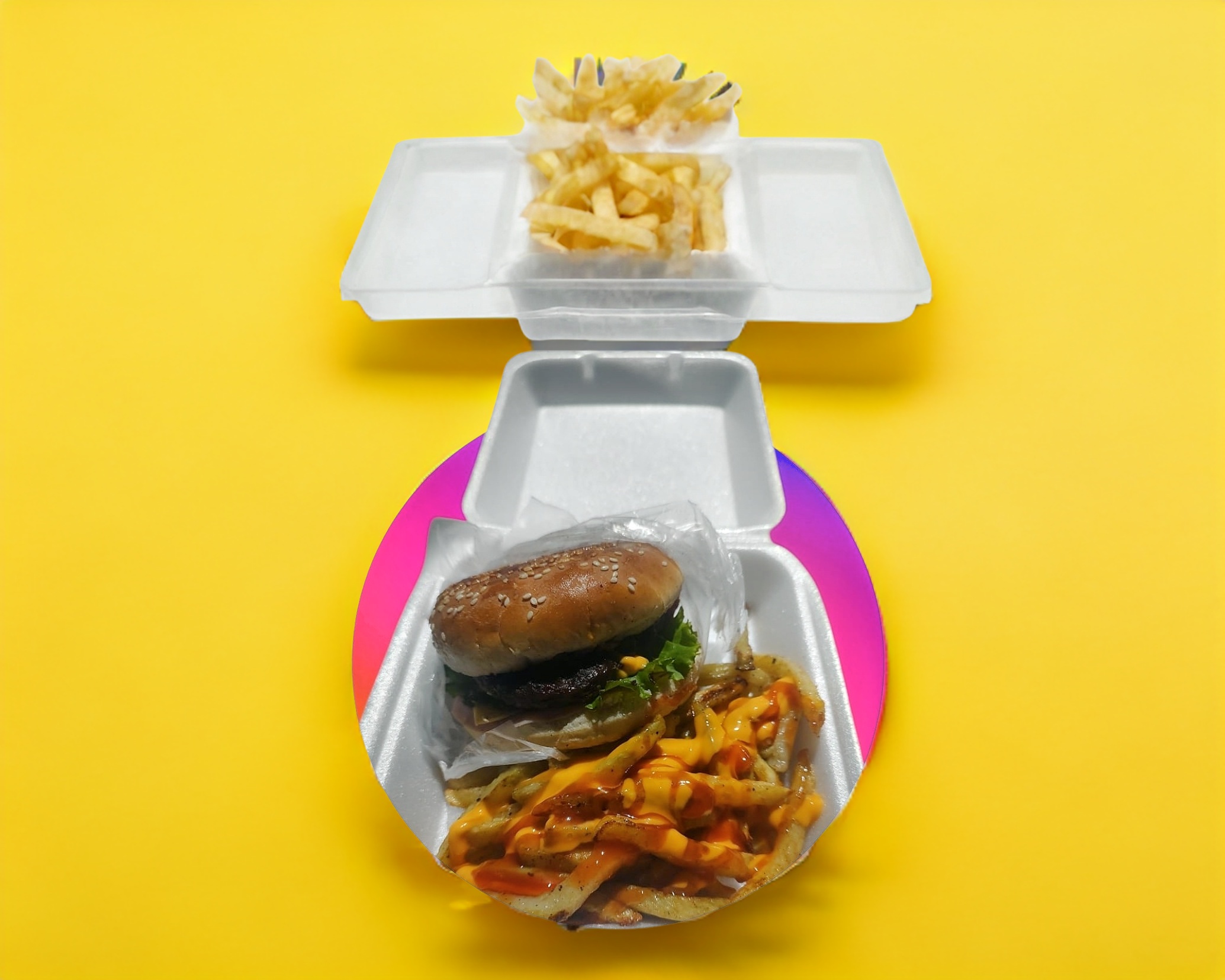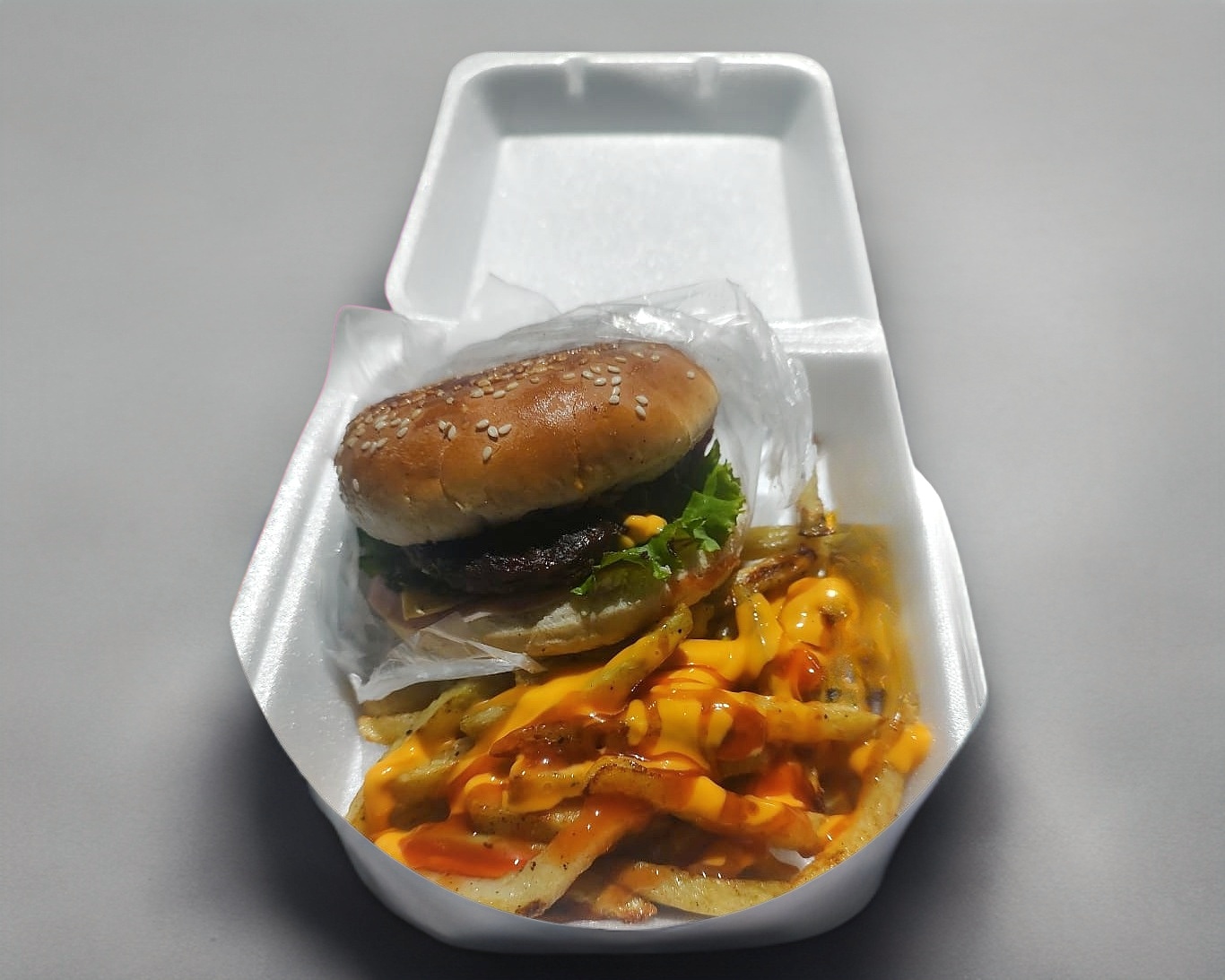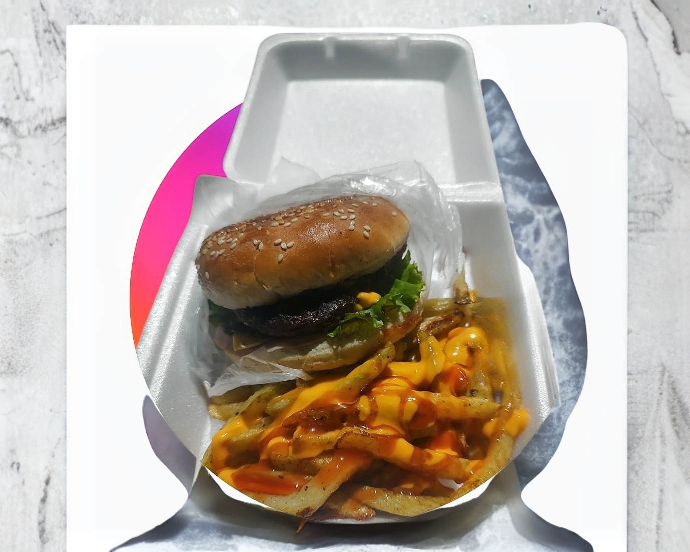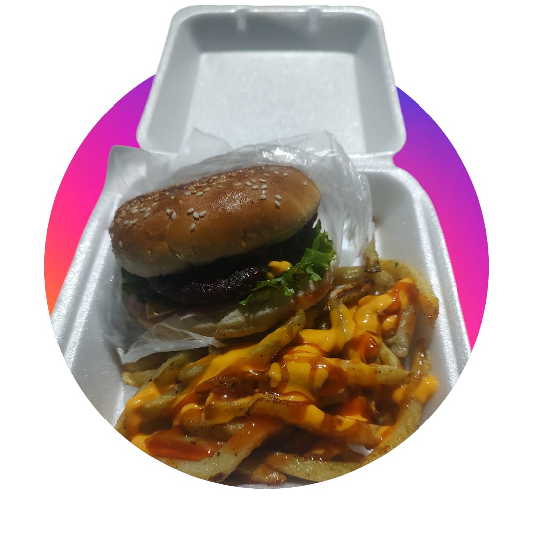 Hamburguesa de carne de res 100% (aproximadamente 90 g), con tocino, queso Oaxaca, lechuga, queso amarillo, aderezo y acompañada de una porción personal de papa francesa.