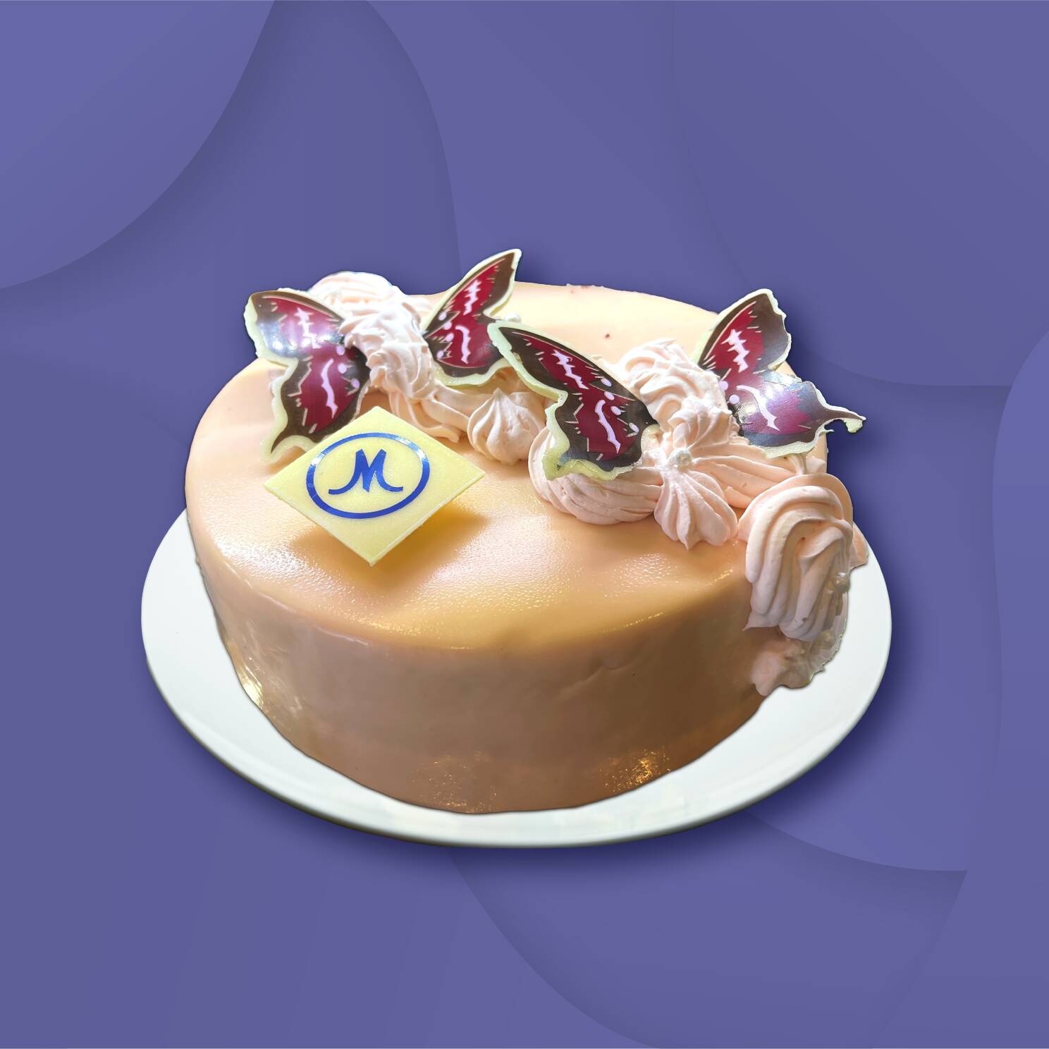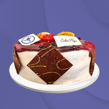 Es un delicioso biscuit de chocolate bañado con jarabe, relleno con crema de nata y salsa de zarzamora, decorado con frutas de la temporada y motivos de chocolate.