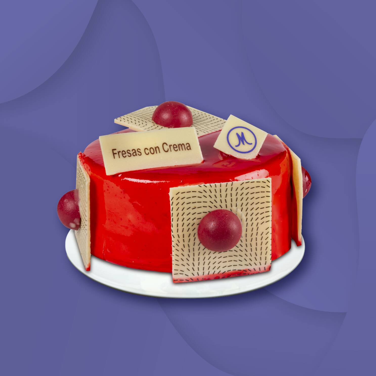 Biscuit laminado de feite relleno de crema pastelera natural y fresas fileteadas decorado con fresas globo en mitades y motivos de chocolate.