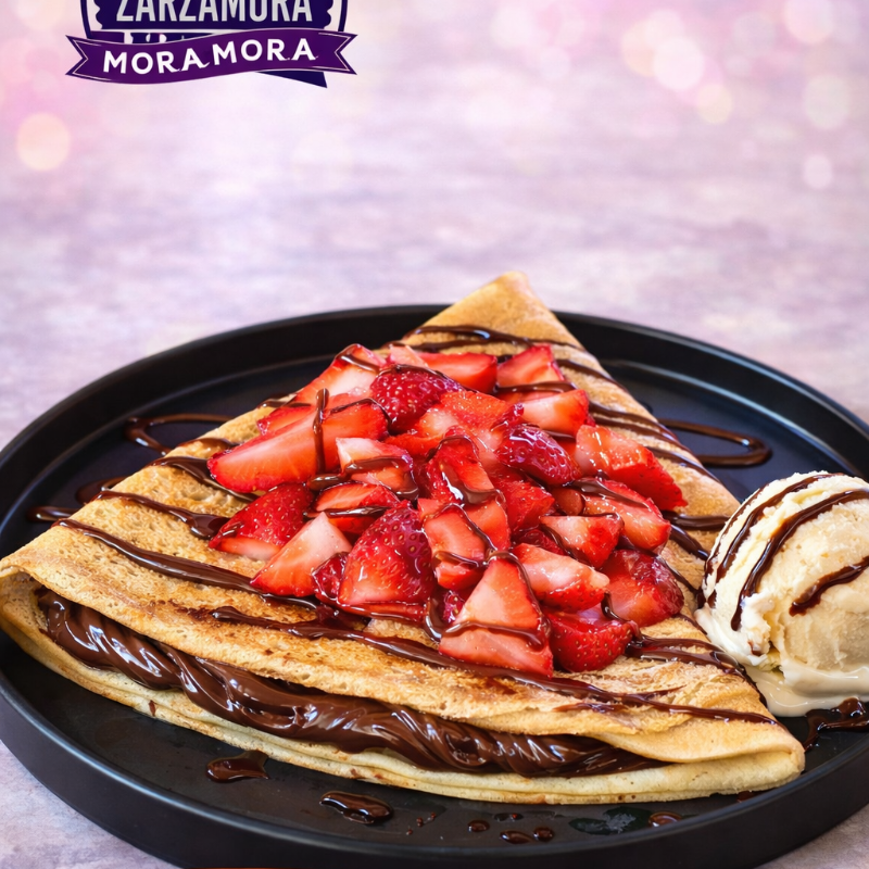 Crepa suave y recién hecha, rellena de fresas frescas y jugosas, bañadas en una crema dulce y cremosa que se derrite en cada bocado. Un postre clásico, fresco y delicioso que siempre se antoja. 😍 El toque dulce ideal de Mora Mora Zarzamora.