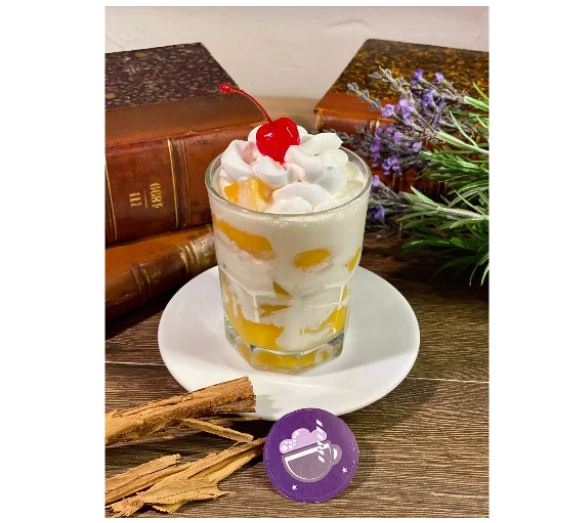 Duraznos con crema con topping de chantilly y una cereza.