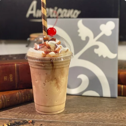 Frappé de caramelo ocn crema chantilly y cereza.