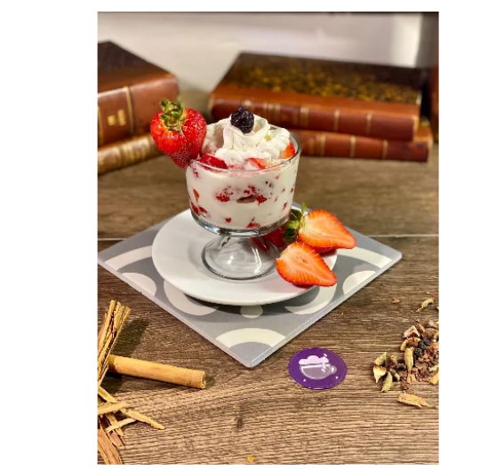 Fresas con crema con topping de chantilly y una zarzamora.