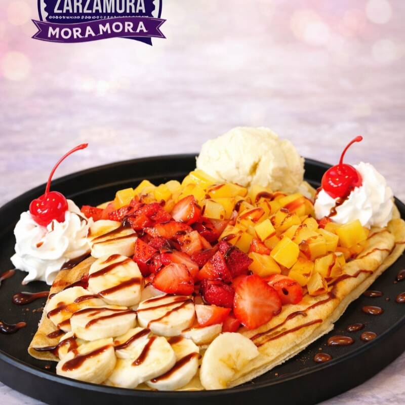 Crepa suave y recién hecha, rellena de una deliciosa combinación de frutas frescas de temporada, acompañadas de un toque dulce que realza su sabor natural. Colorida, ligera y perfecta para cerrar tu comida con algo fresco y delicioso. 😍 El equilibrio perfecto de sabor en Mora Mora Zarzamora.