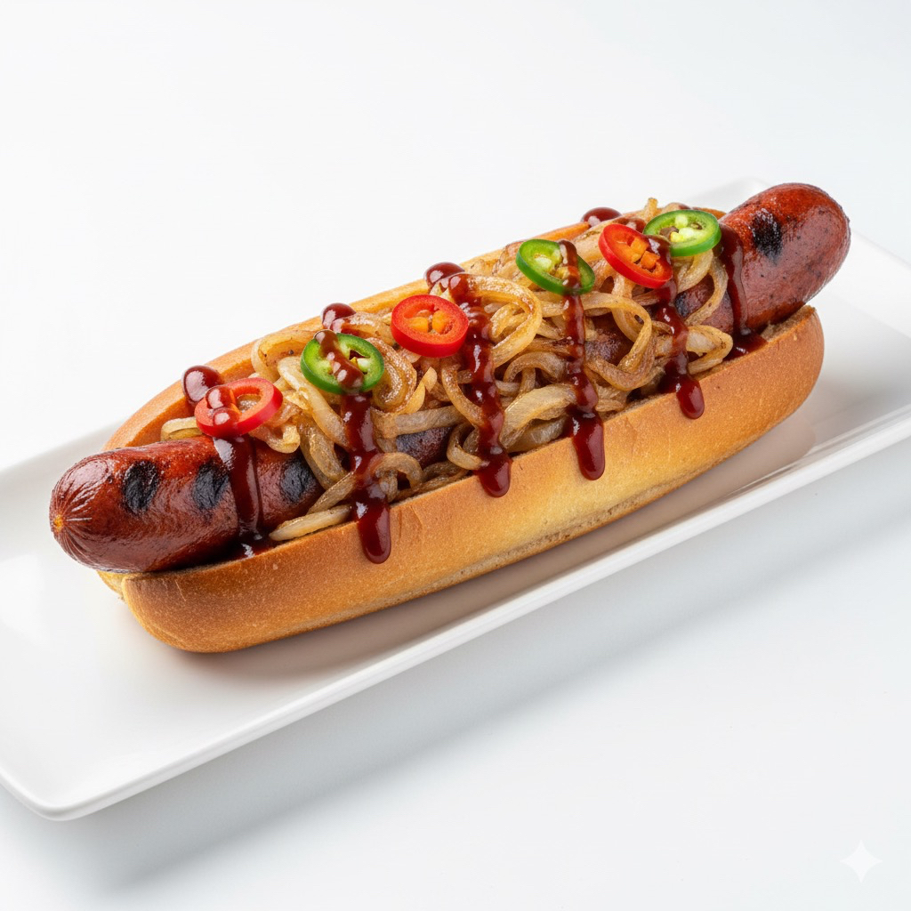 Pan Gourmet, salchicha alemana de 30 cm, cebollas caramelizadas, rajas de chiles, BBQ.