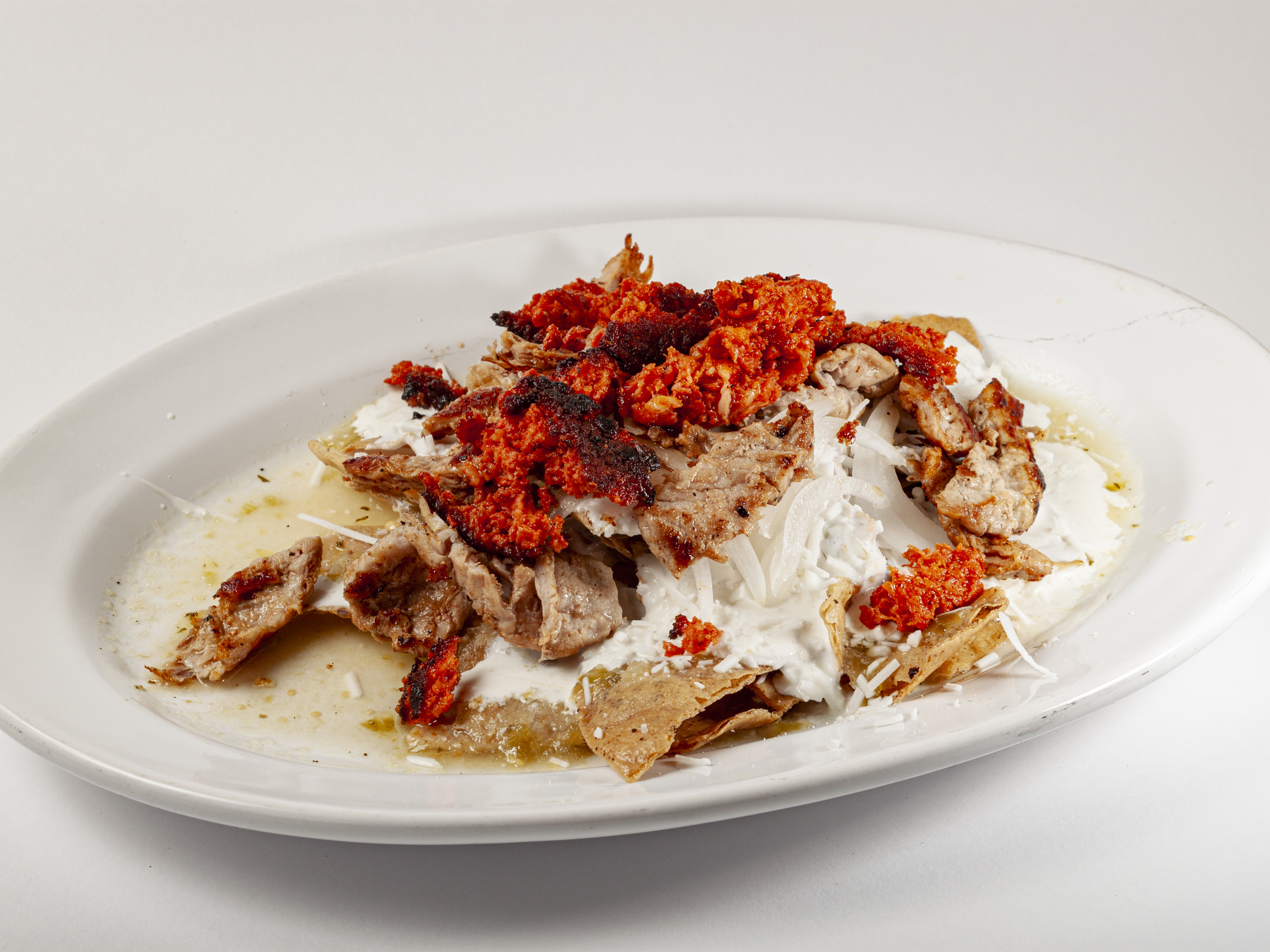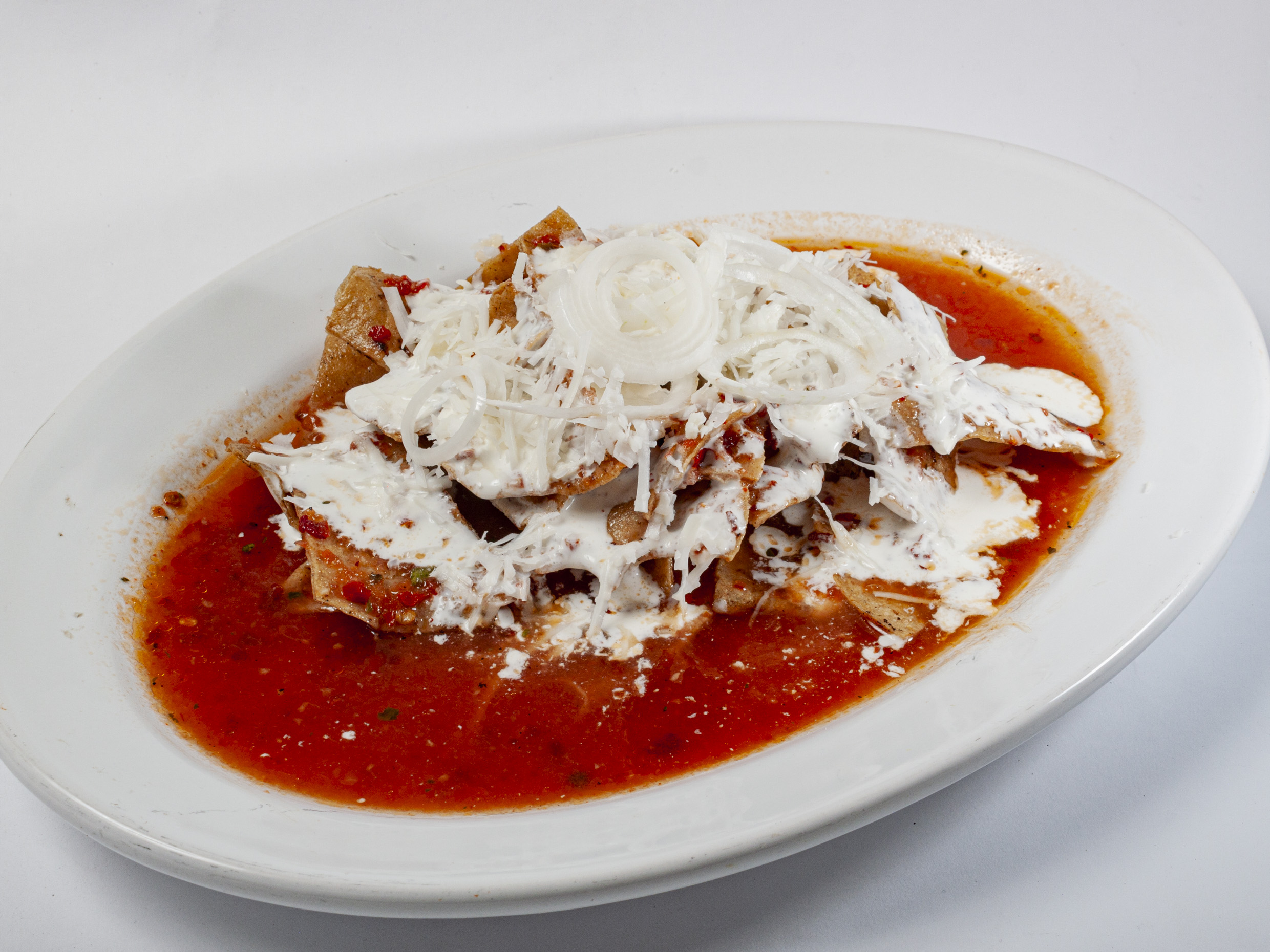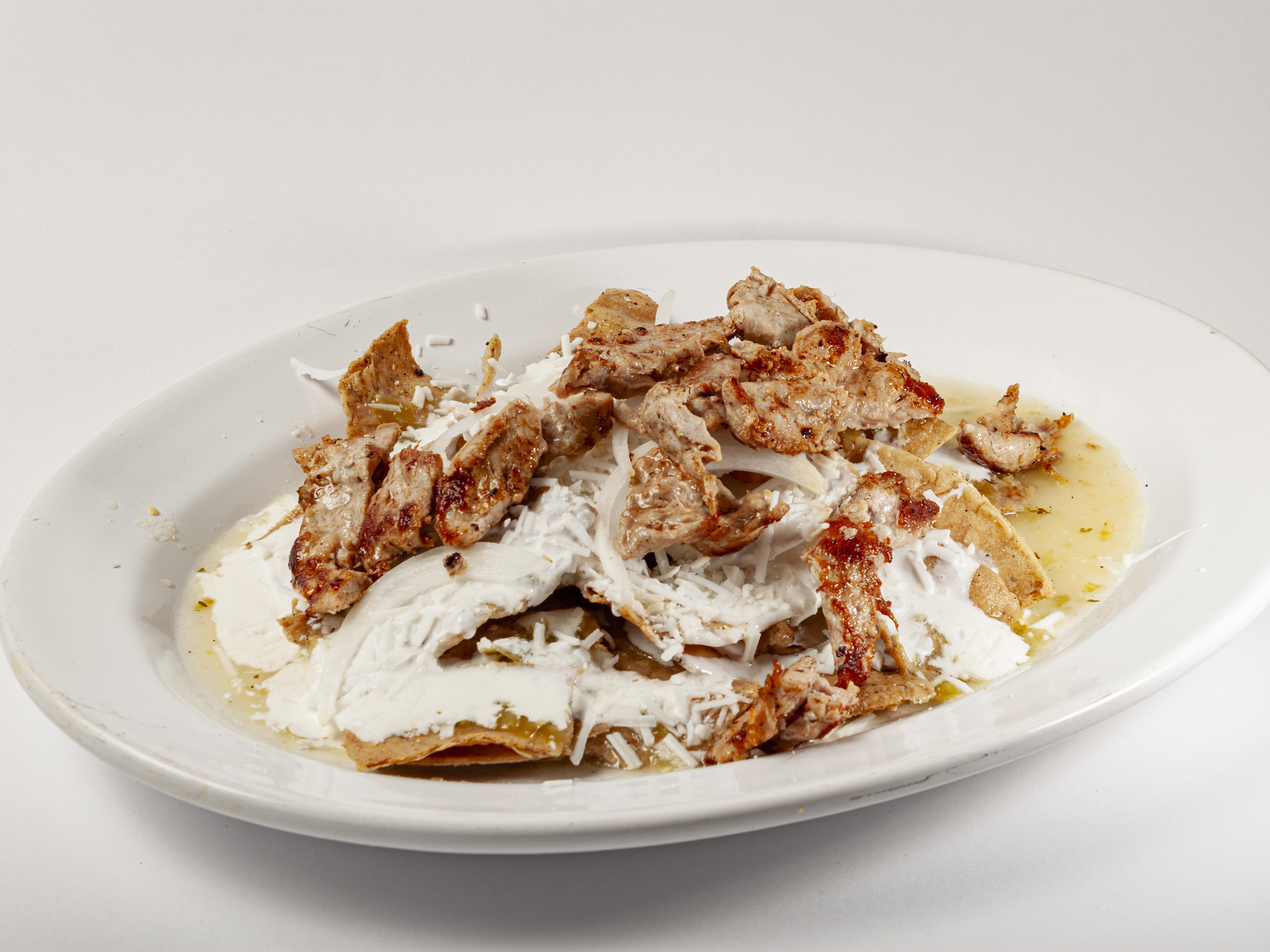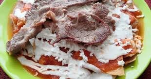 Chilaquiles con totopos de harina de maiz Rojos Con Bistec (100 Gr), incluye crema, queso rayado , cebolla.+(Refresco de 355 ml presentacion botella)