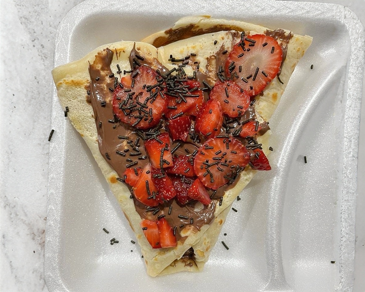 Crepa dulce con una porción de nutella untada con trozos de fresa natural.
