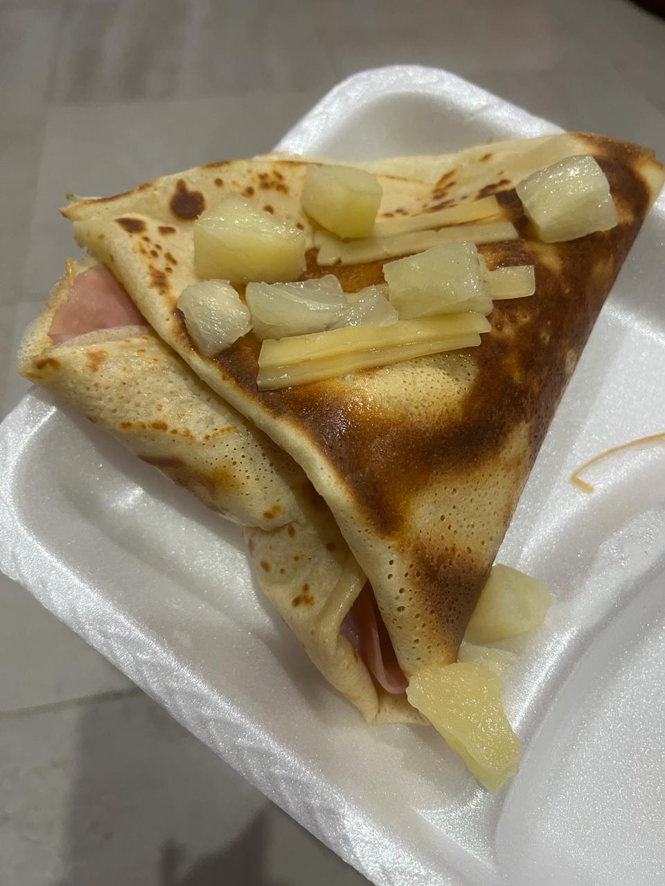Crepa salada con rebanadas de jamón de pavo, queso manchego y trozos de piña en almíbar.
