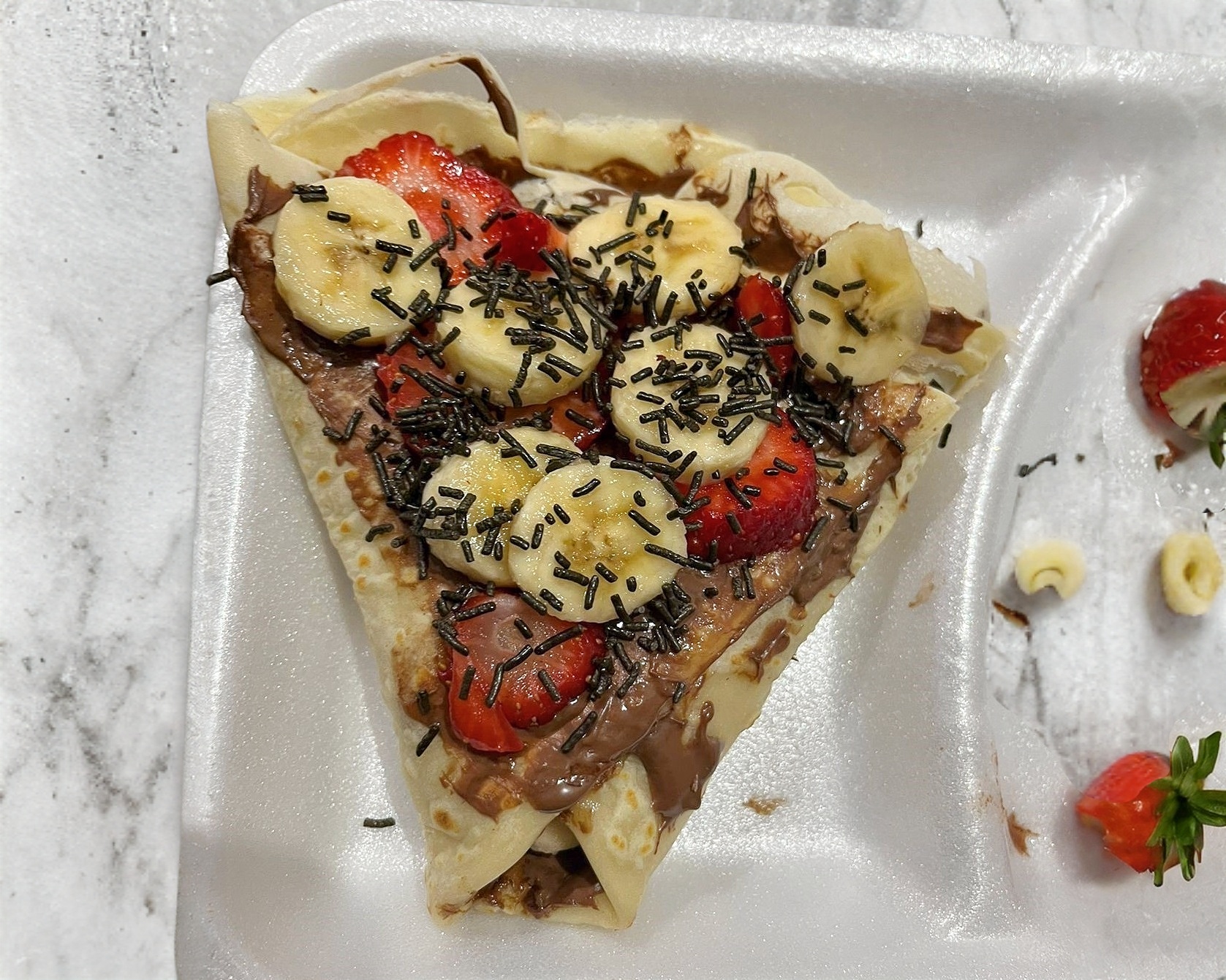 Crepa dulce con una porción de nutella untada con trozos de plátano y fresa natural.