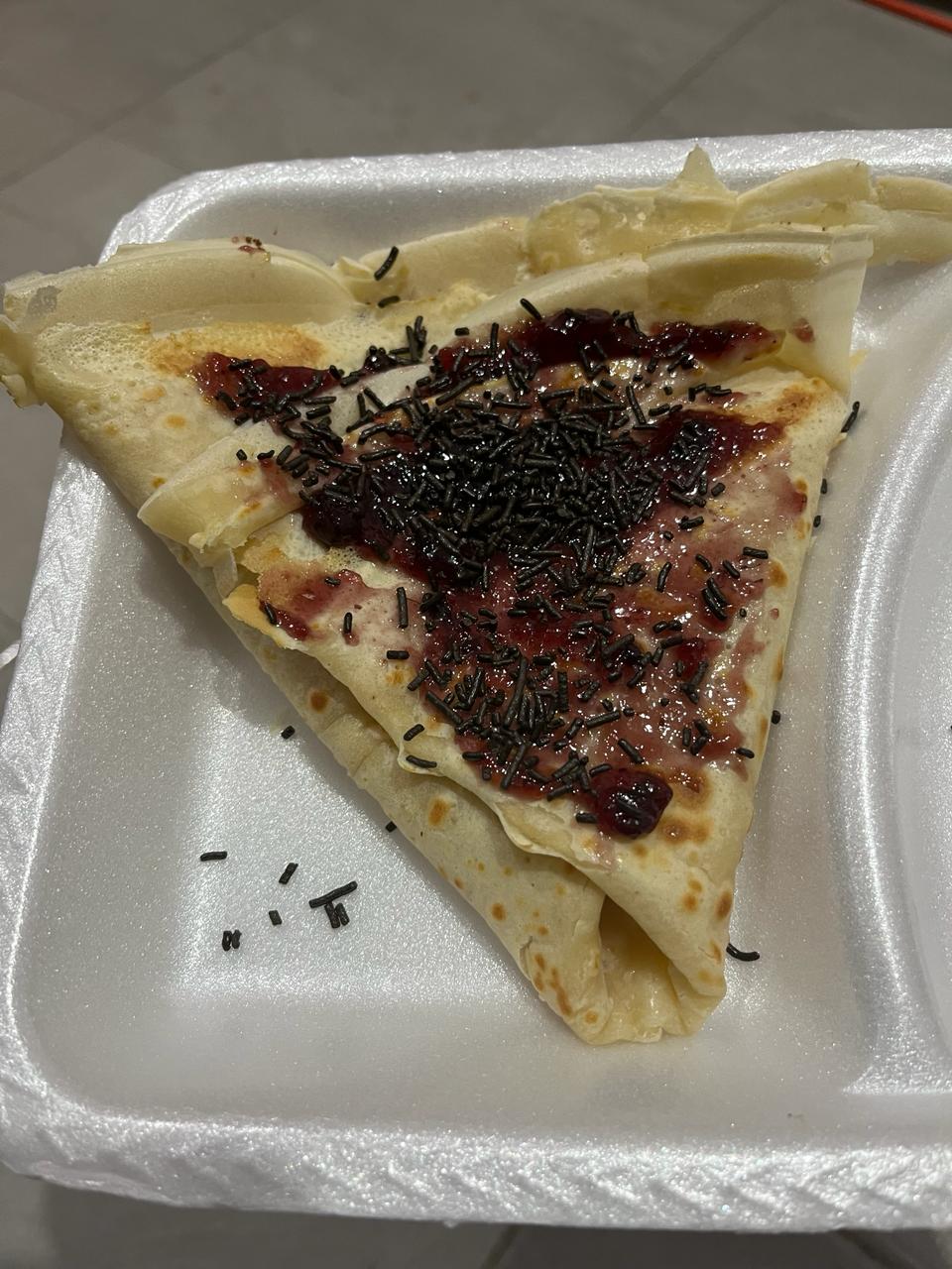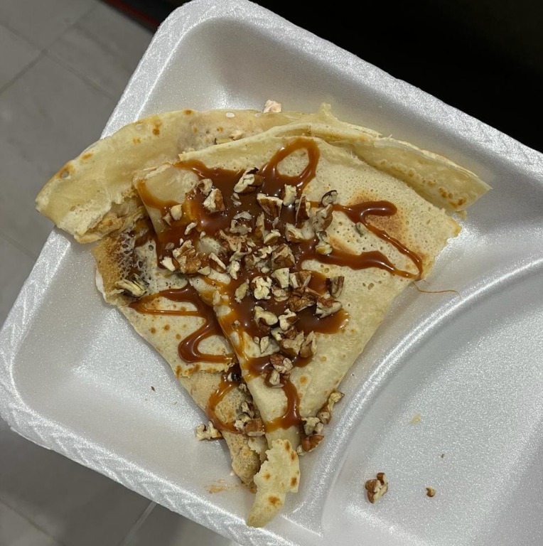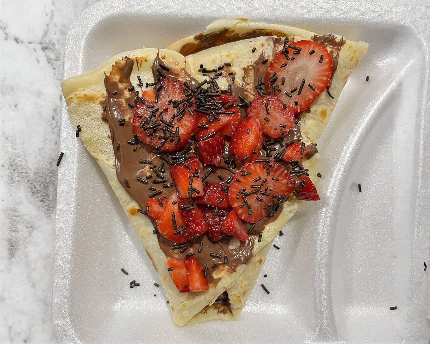 Crepa dulce de 1 ingrediente de base mermelada, queso crema, cajeta con opción de agregar un extra fruta, helado, nuez, jarabe de chocolate, crema batida.