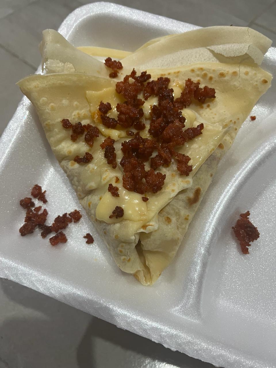 Crepa dulce con una porción de queso philadelphia untado con trozos de mango y lechera.