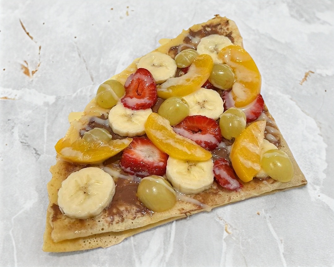 Crepa dulce con una base a elegir y trozos de durazno, fresa, mango, plátano, y uva