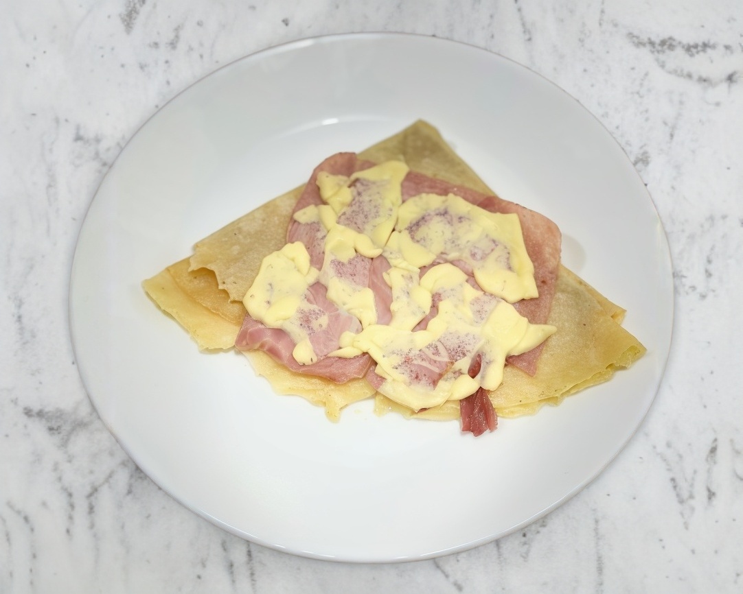 Crepa salada con rebanadas de jamón de pavo y queso manchego.