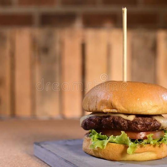 Carne de res, bollo brioche, queso americano, mayonesa, catsup, mostaza, lechuga, jitomate, cebolla