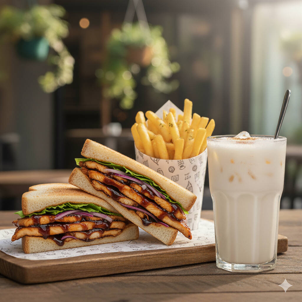 Sandwich doradito de pechuga de pollo a la bbq, queso manchego, aderezo y verduras.