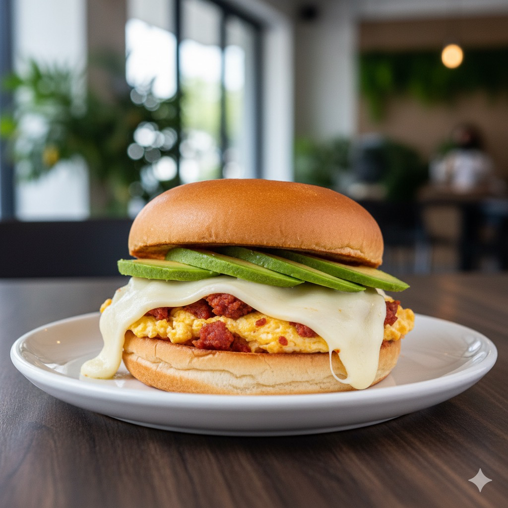 Bollo brioche dorado en mantequilla, huevo revuelto con chorizo, quesillo, aguacate, aderezo y verduras