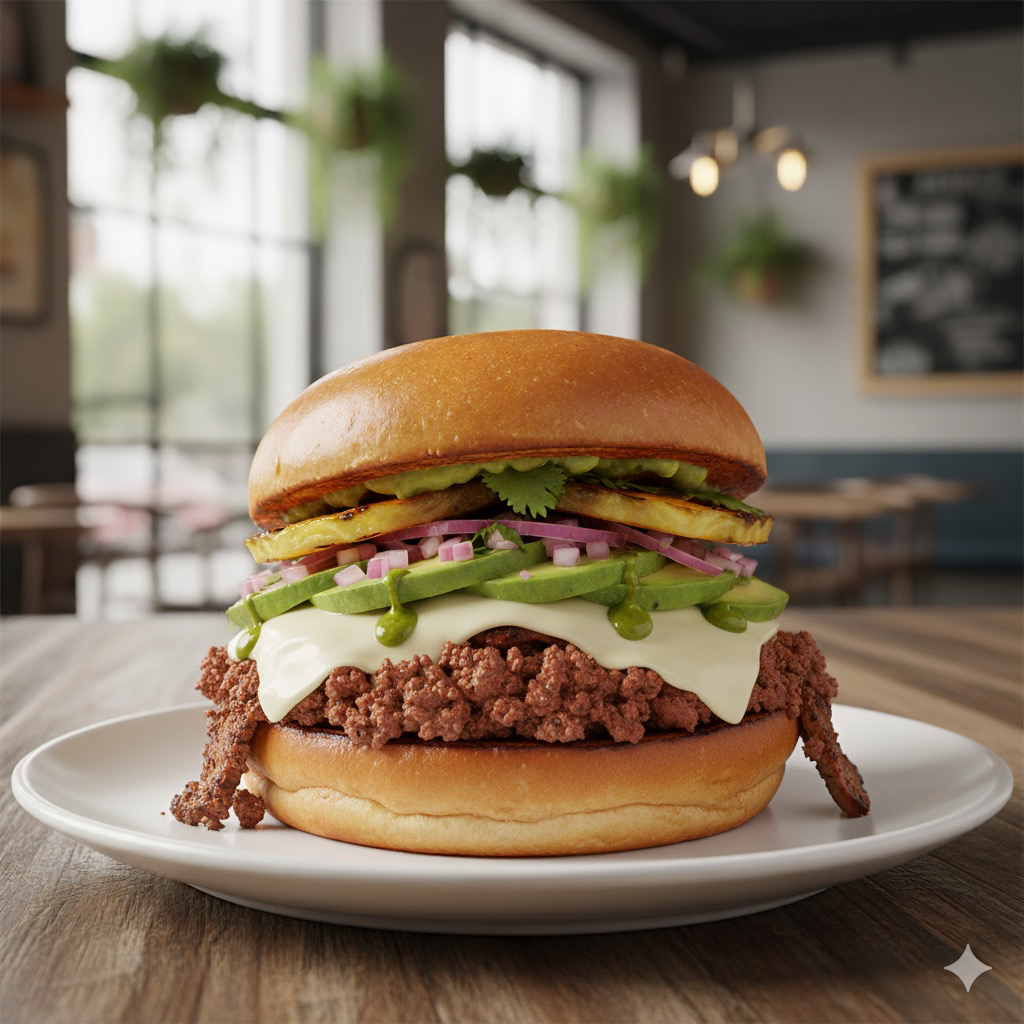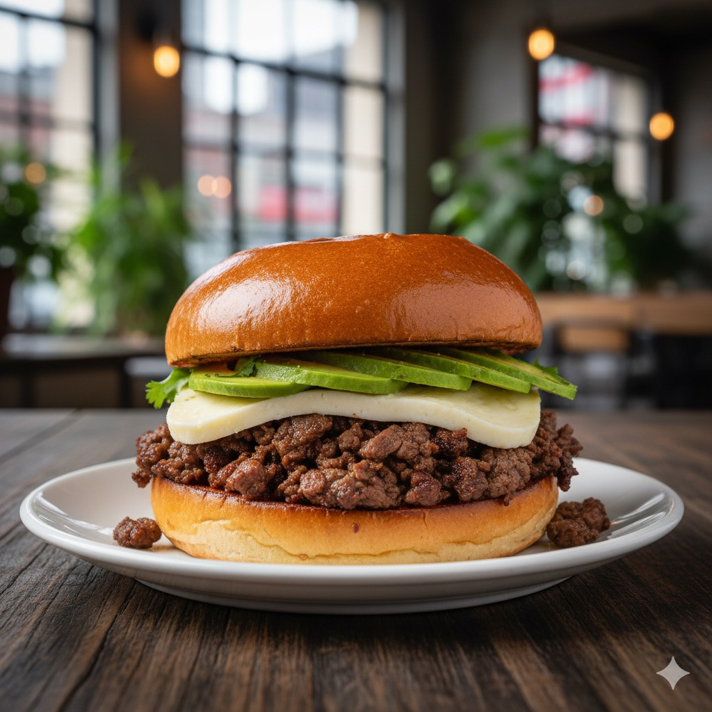 Bollo brioche dorado en mantequilla, carne al pastor, quesillo, aguacate, aderezo y verduras