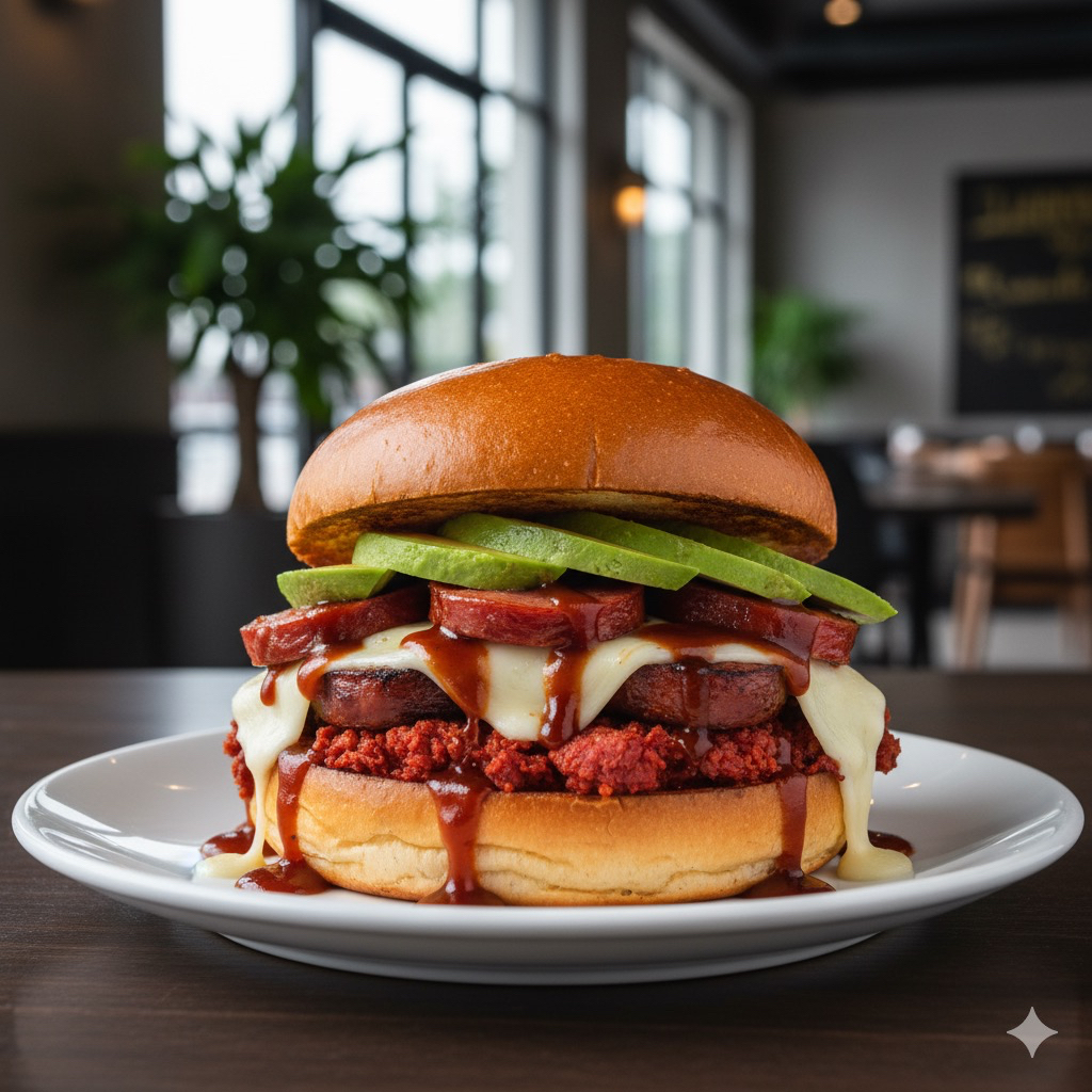 100gr de carne de res, bollo brioche, salchicha, jamon, queso Oaxaca, queso americano, lechuga, jitomate, cebolla, jalapeños, cátsup, mostaza