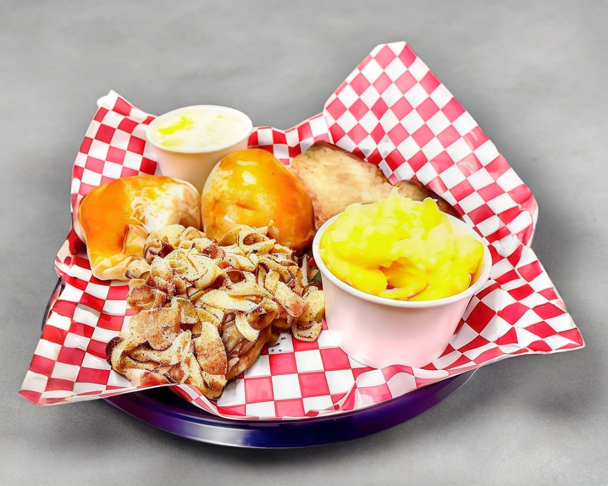 150 gr de brisket, 150 gr de pulled pork, dos acompañamientos chicos (frijoles Mr. Texas, Puré de papa, Mac & cheese) , 2 piezas de pan