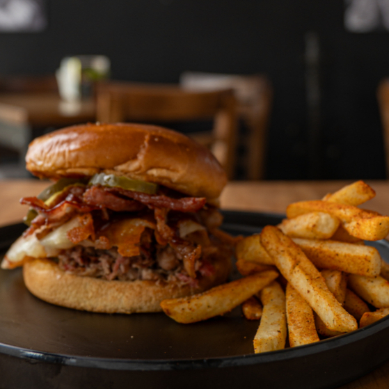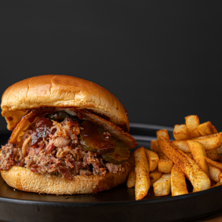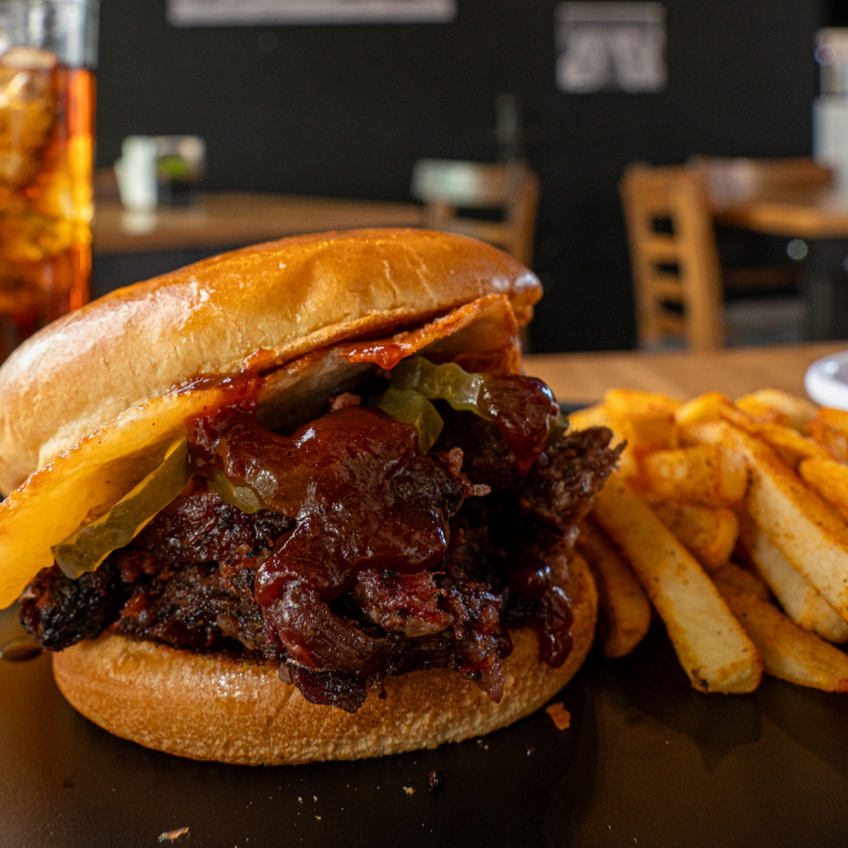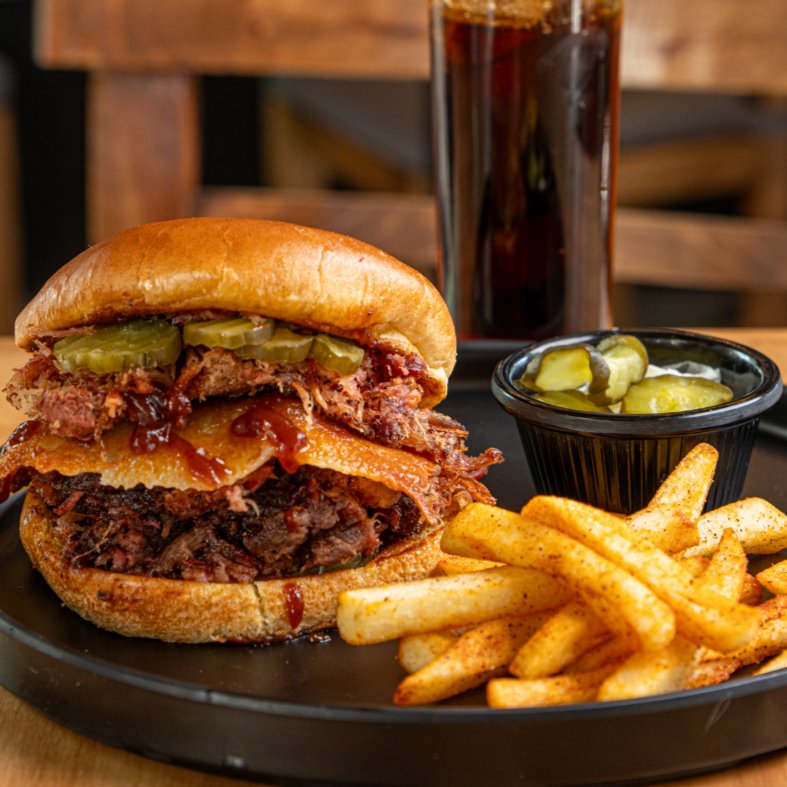 150 gr de carne ahumada durante 8 horas con leña de encino rojo, al más puro estilo texano, con costra de queso, cebolla, pepinillos, acompañado con 150 gr de nuestras papas a la francesa