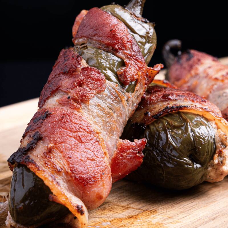 Tres chiles jalapeños ahumados, rellenos de queso crema con Pulled Pork y envueltos en tocino