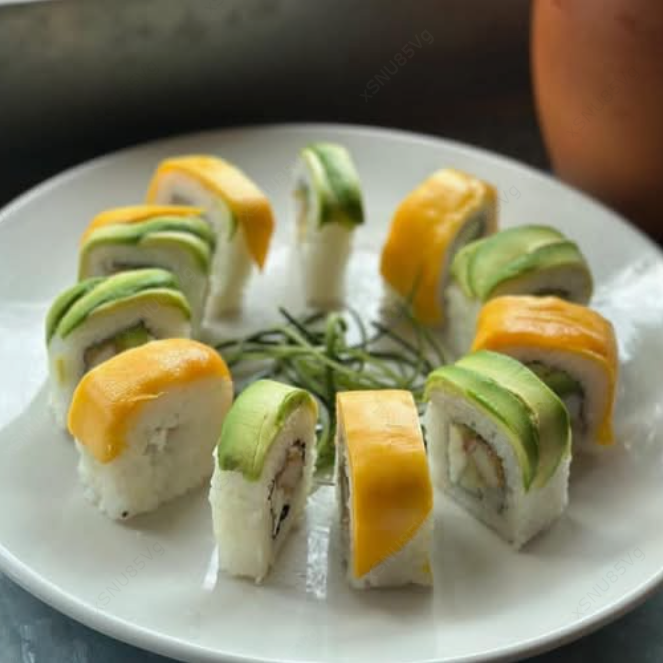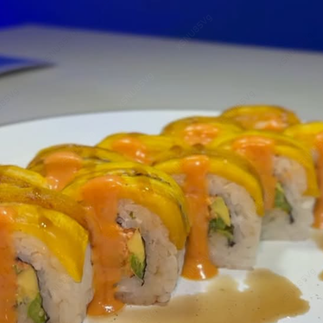 Cangrejo empanizado, aguacate, pepino y queso philadelphia. XF: Mango, aguacate, nuez caramelizada y salsa de anguila.
