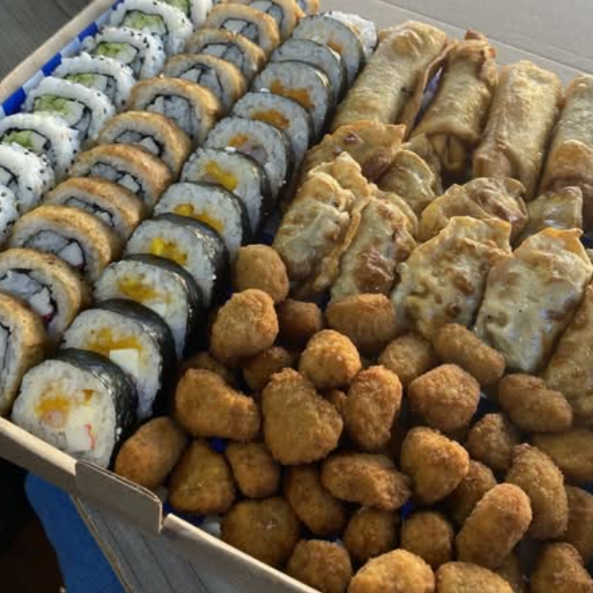 Caja para 4 - 6 Personas Contiene: Rollo empanizado Rollo california Rollo de mango Dumplings Rollos primavera Palomitas de pollo.