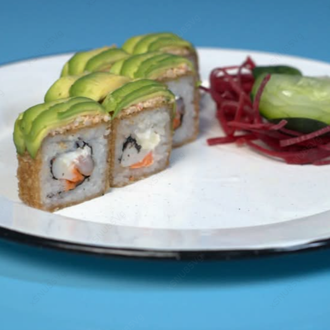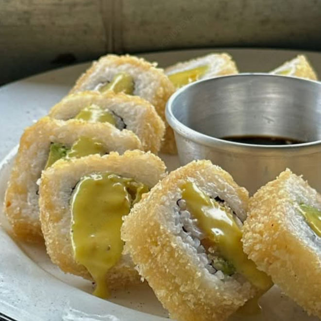 Rollo camarón tempura XD: Camarón empanizado, cangrejo, queso philadelphia. XF: Empanizado con salsa de guacamole habanero.