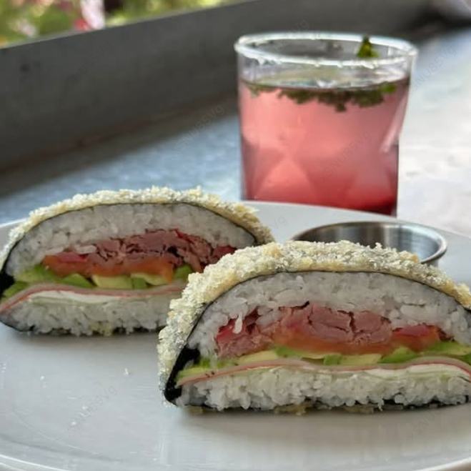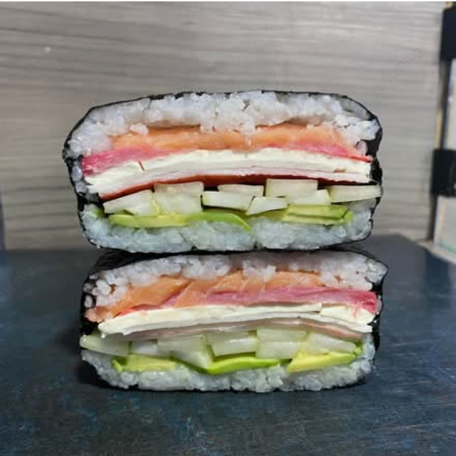 Hamburguesa de sushi rellena de salmón, atún ahumado, aguacate, pepino, cangrejo y queso philadelphia.