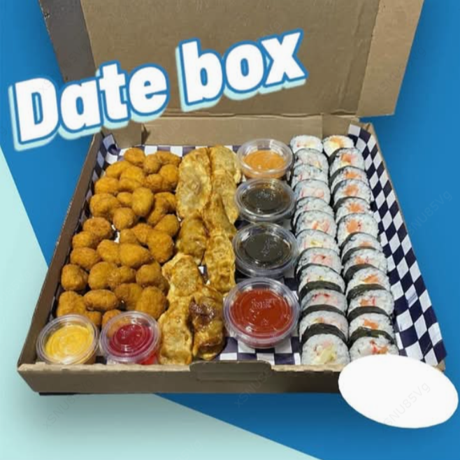 Caja 2 o 3 personas para una date inolvidable Contiene: Rollo california Rollo de mango Palomitas de pollo Dumplings