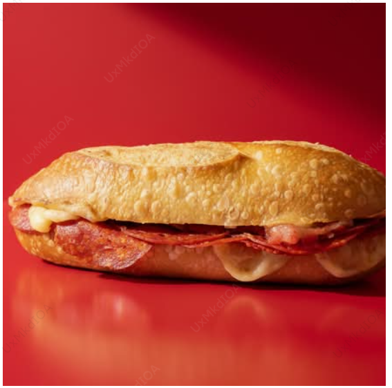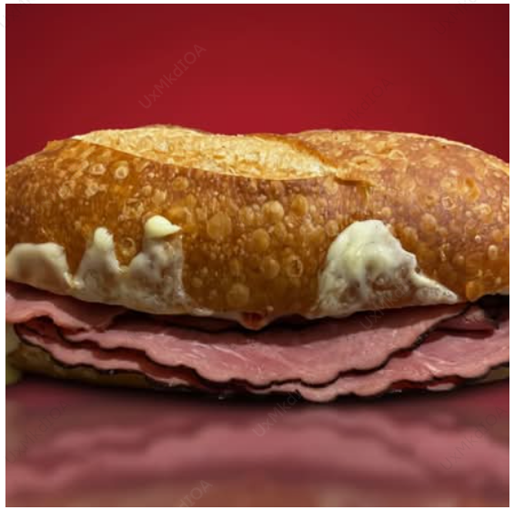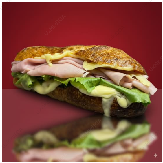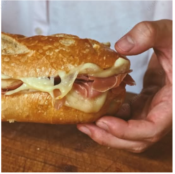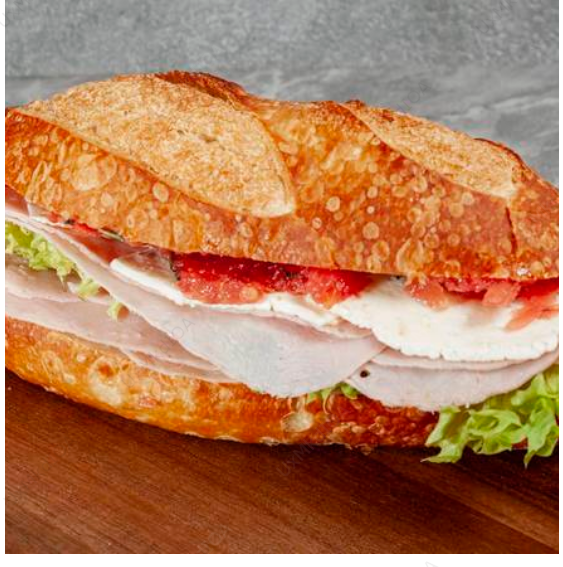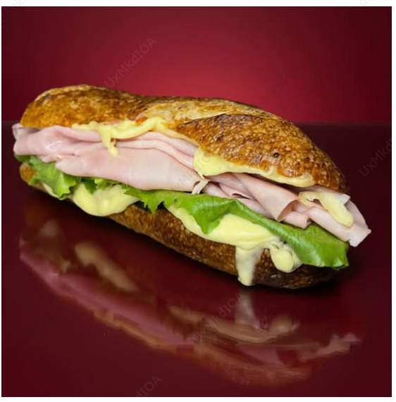 Sándwich de jamón horneado artesanal hecho en Chipilo, Puebla, y queso Chihuahua Super Fino derretido sobre baguette de masa madre con tumaca, (salsa a base de jitomate, aceite de oliva y hierbas finas), 100 g de proteína. Lechuga opcional.