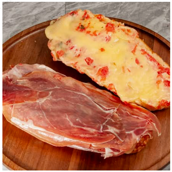 Sándwich de jamón serrano y queso gouda derretido sobre baguette de masa madre con tumaca, (salsa a base de jitomate, aceite de oliva y hierbas finas), 100 g de proteína.