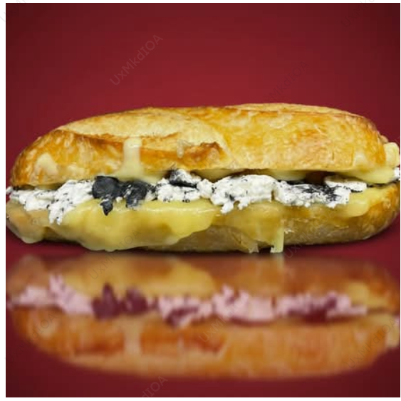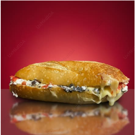 Sándwich vegetariano con el doble de queso de cabra con ceniza, gouda y manchego gratinado sobre baguette de masa madre con tumaca, (salsa a base de jitomate, aceite de oliva y hierbas finas), 200 g de proteína.